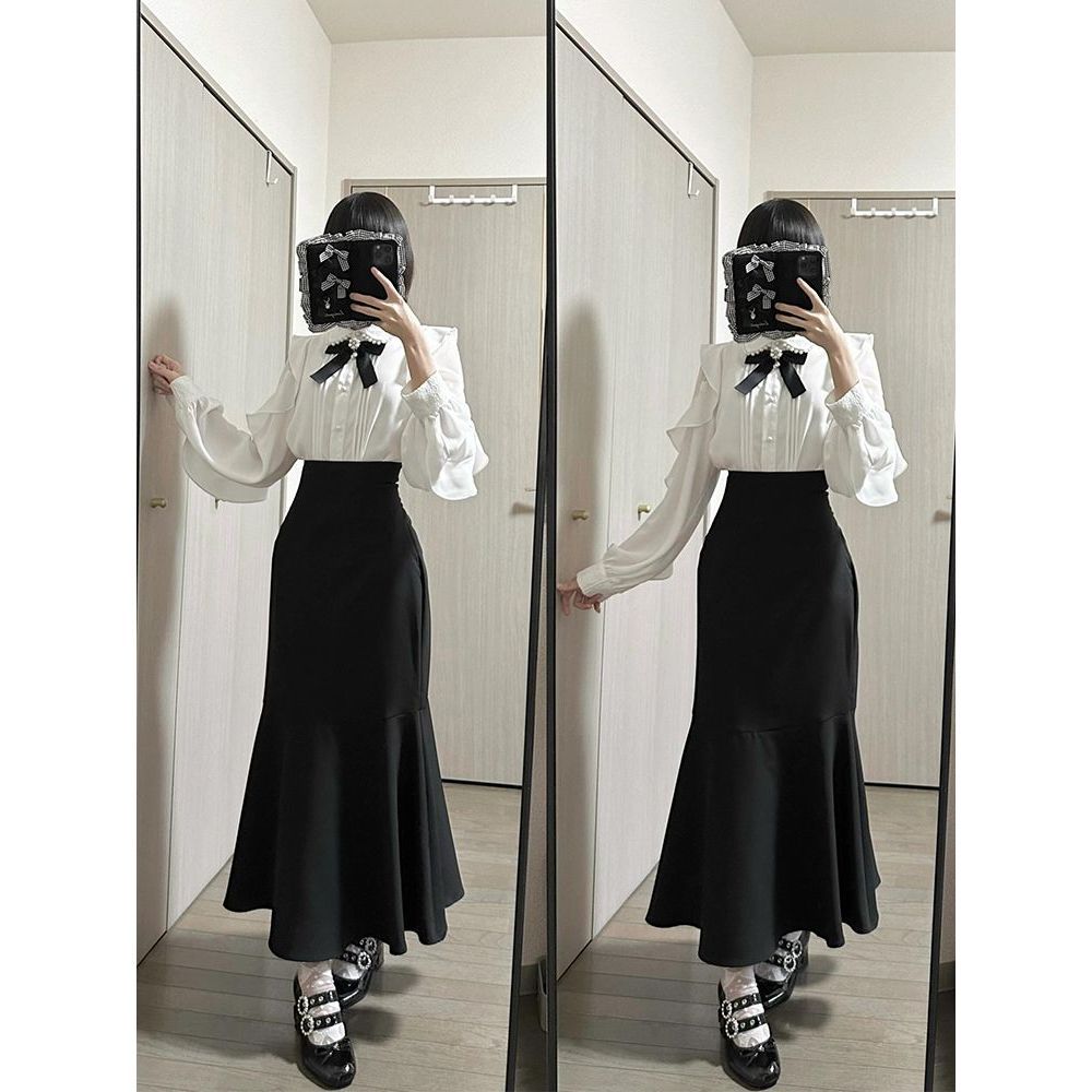 かわいい日本製シャツ、大量生産パールカラートップ、レディースブラックAラインフィッシュテールスカートスーツ