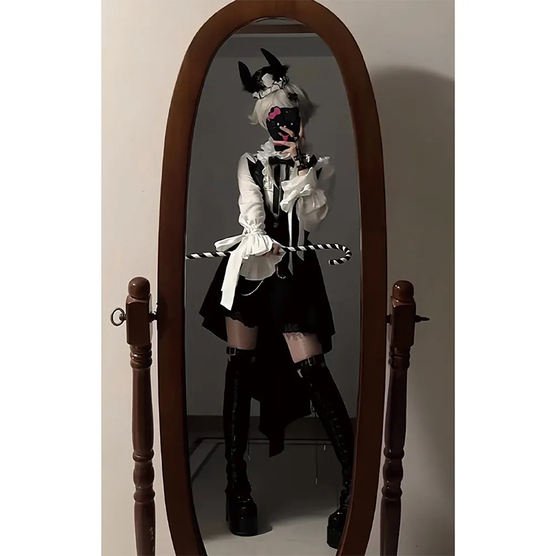 暗黑泡泡龙 经典黑白配色长袖套装lolita泡泡袖上衣+高腰裙两件套