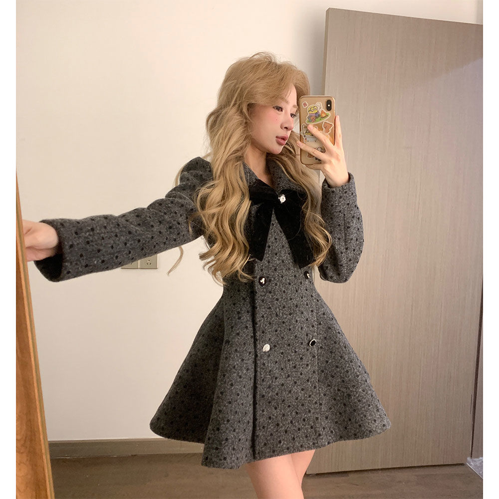 [ミラノドレス] 黒水玉ミドル丈ウエストウールコート レディース 冬 フレンチ高級コート