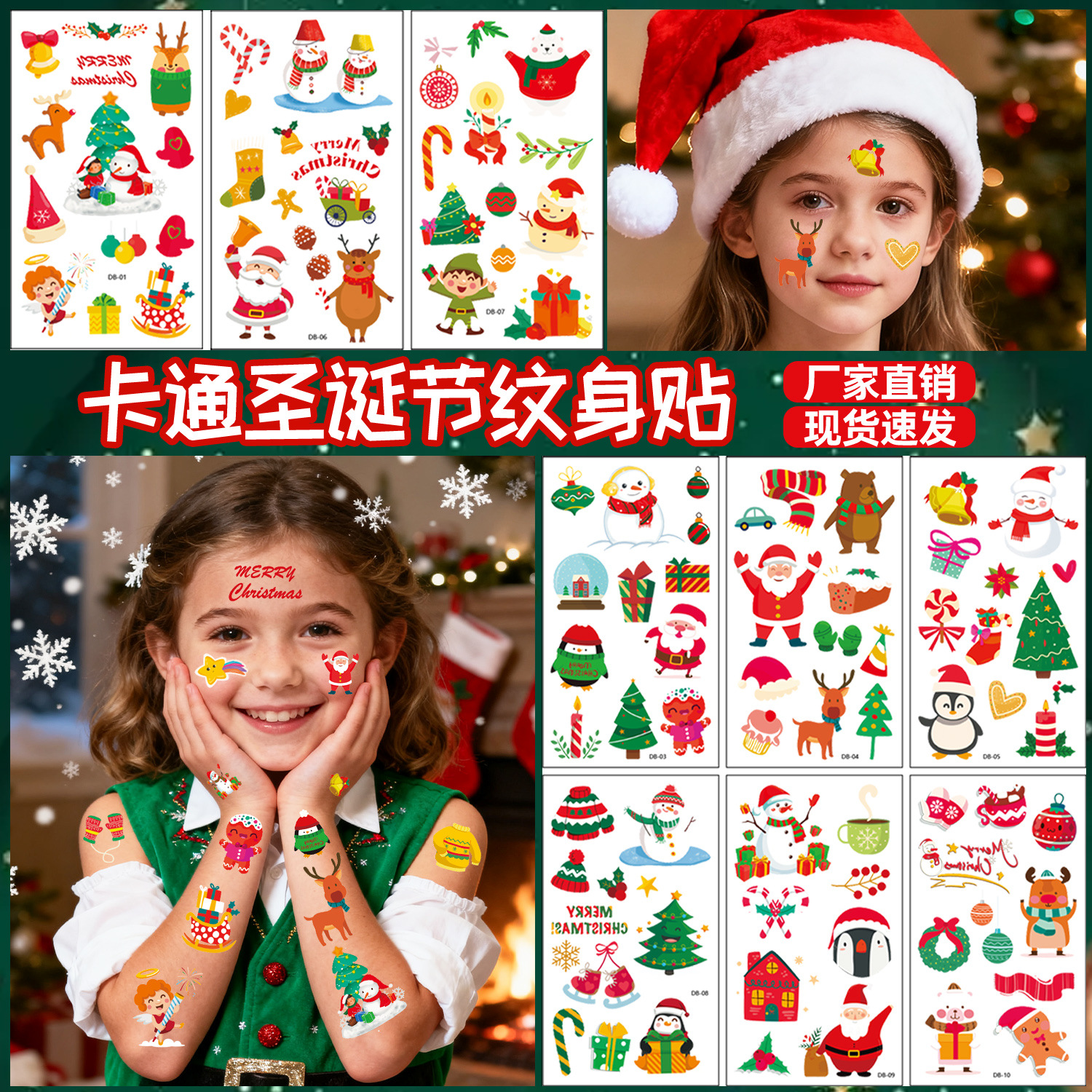 新款跨境卡通圣诞节纹身贴圣诞脸贴水转印贴纸高级感卡通纹身贴