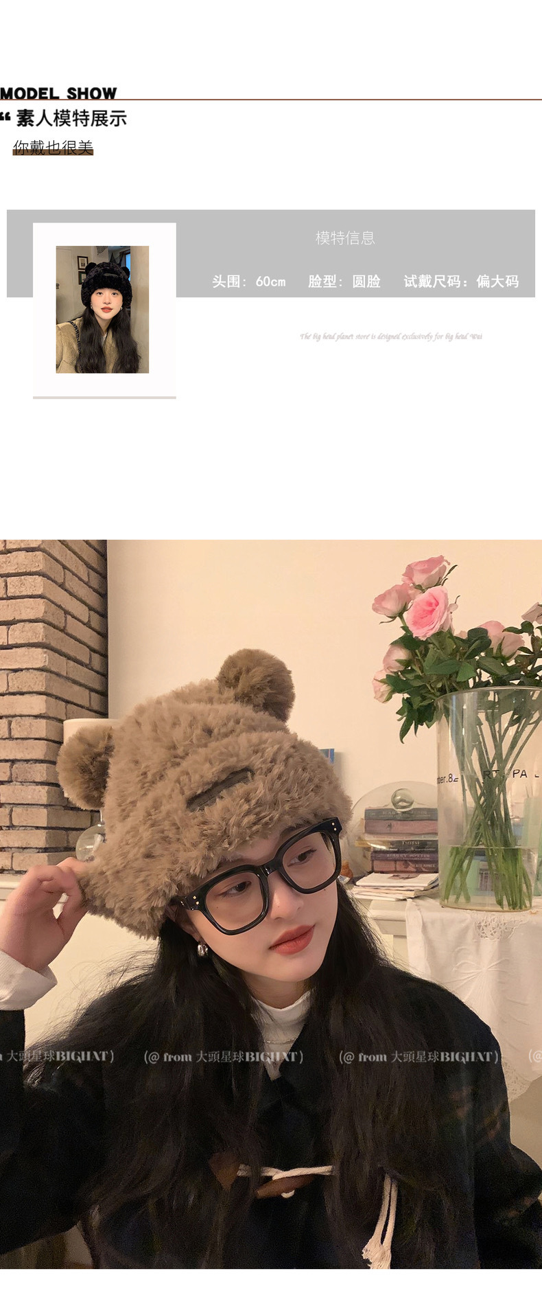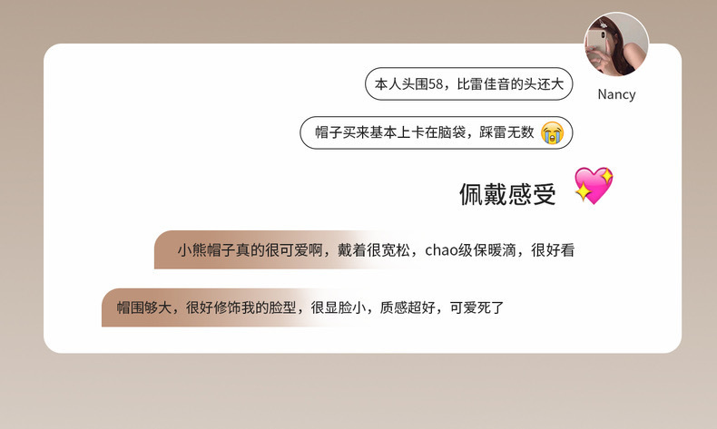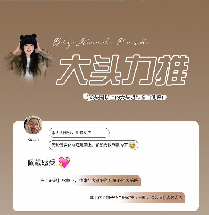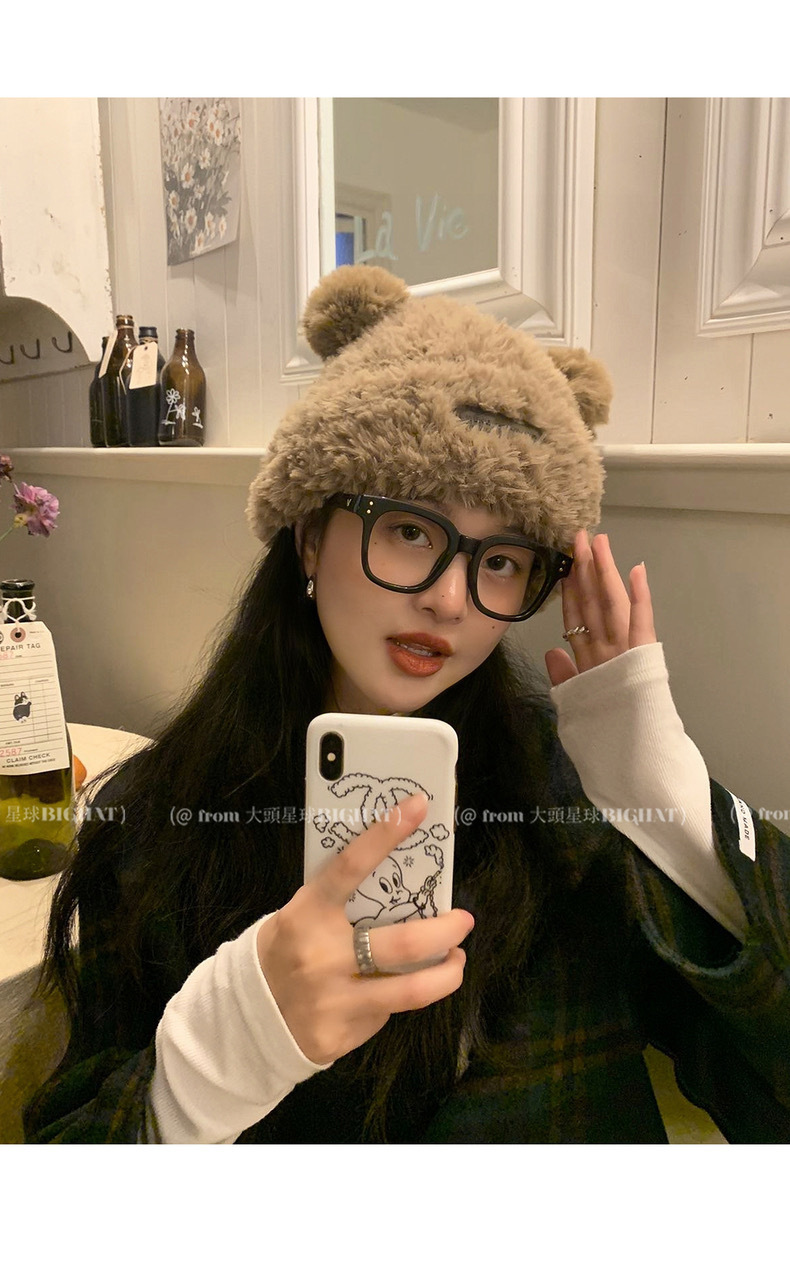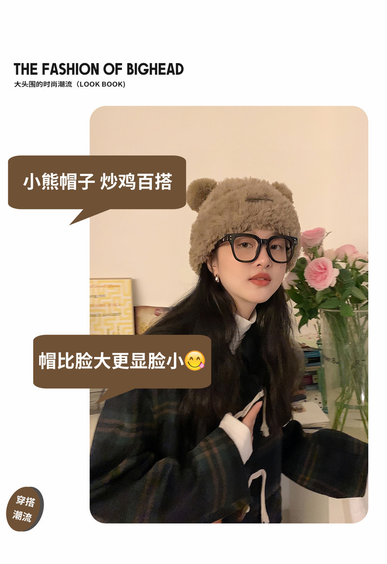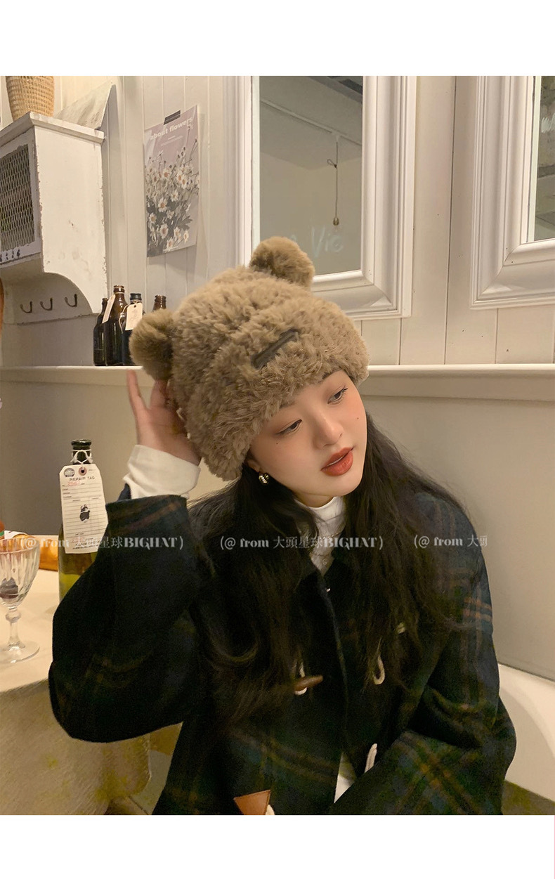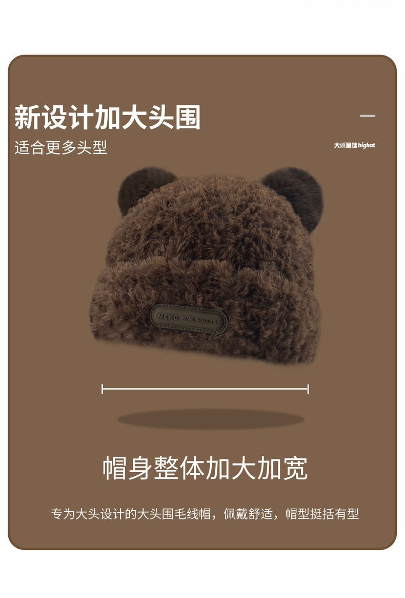 冬季新款女毛绒护耳保暖加厚针织帽子可爱小熊显脸小大头围堆堆帽