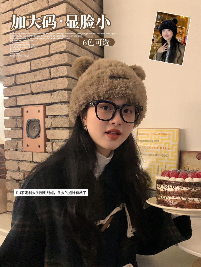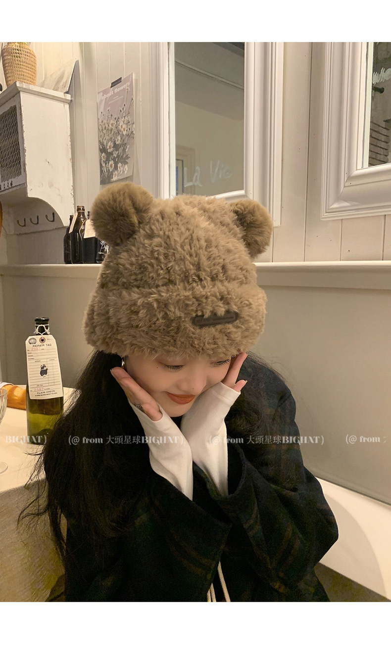可爱小熊毛线帽子女冬季加厚毛绒保暖毛毛包头帽秋冬大头围针织帽