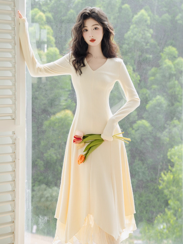 優しいスタイルの女性用長袖ニットドレス2025秋冬新作Vネックウエスト痩身インナー膝上セータードレス