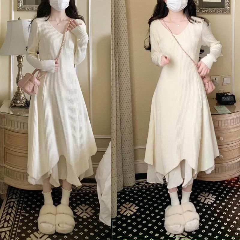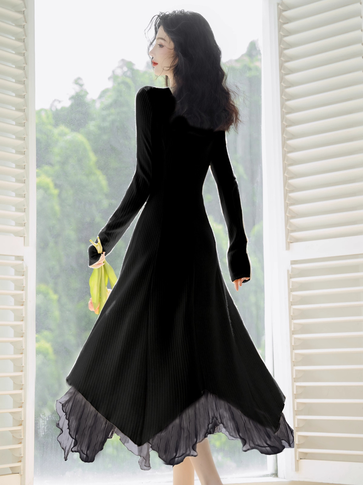秋冬新款不规则拼接收腰大摆打底针织连衣裙女高冷御姐风长裙