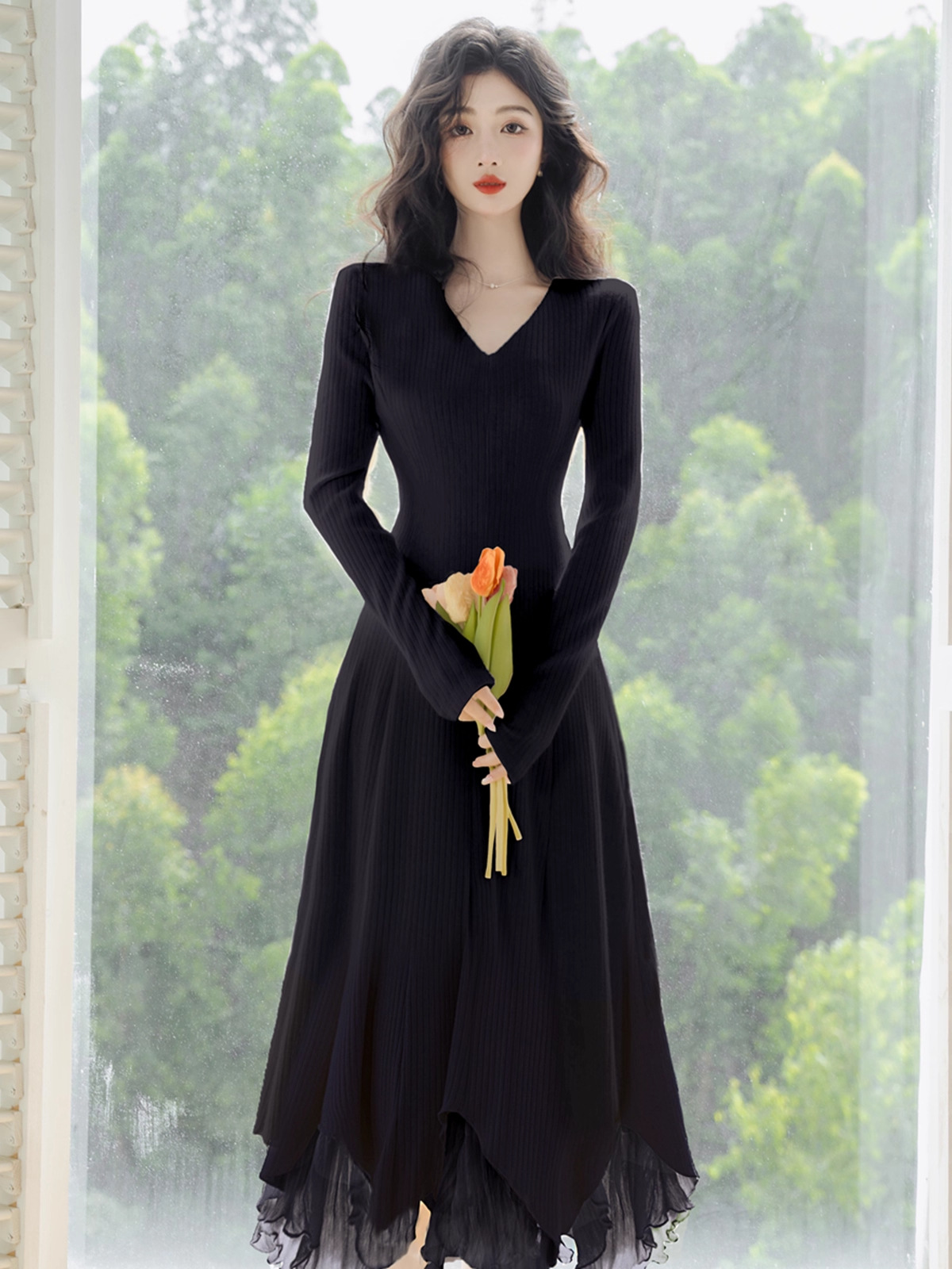 女性のための新しい秋と冬のドレス 2025 ジッパーデザインフレンチブラックミッドレングスボトムニットセータードレス