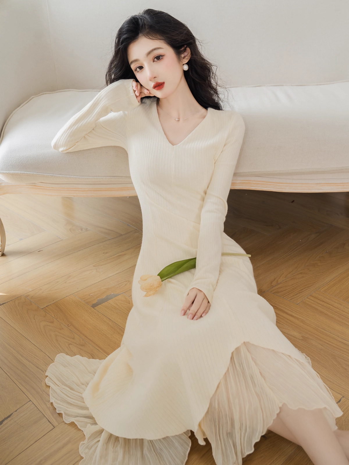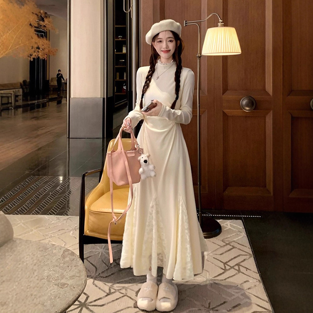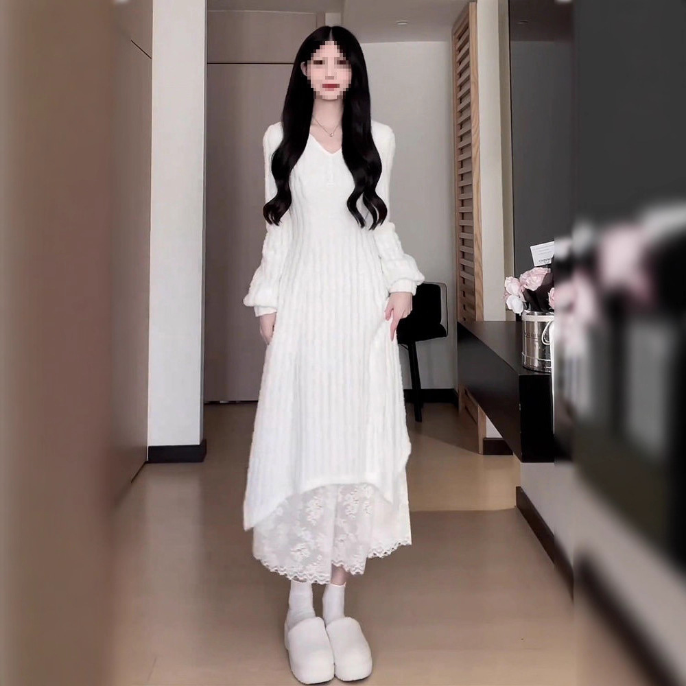 秋冬2025新款法式白色内搭针织连衣裙女收腰显瘦蕾丝拼接鱼尾长裙
