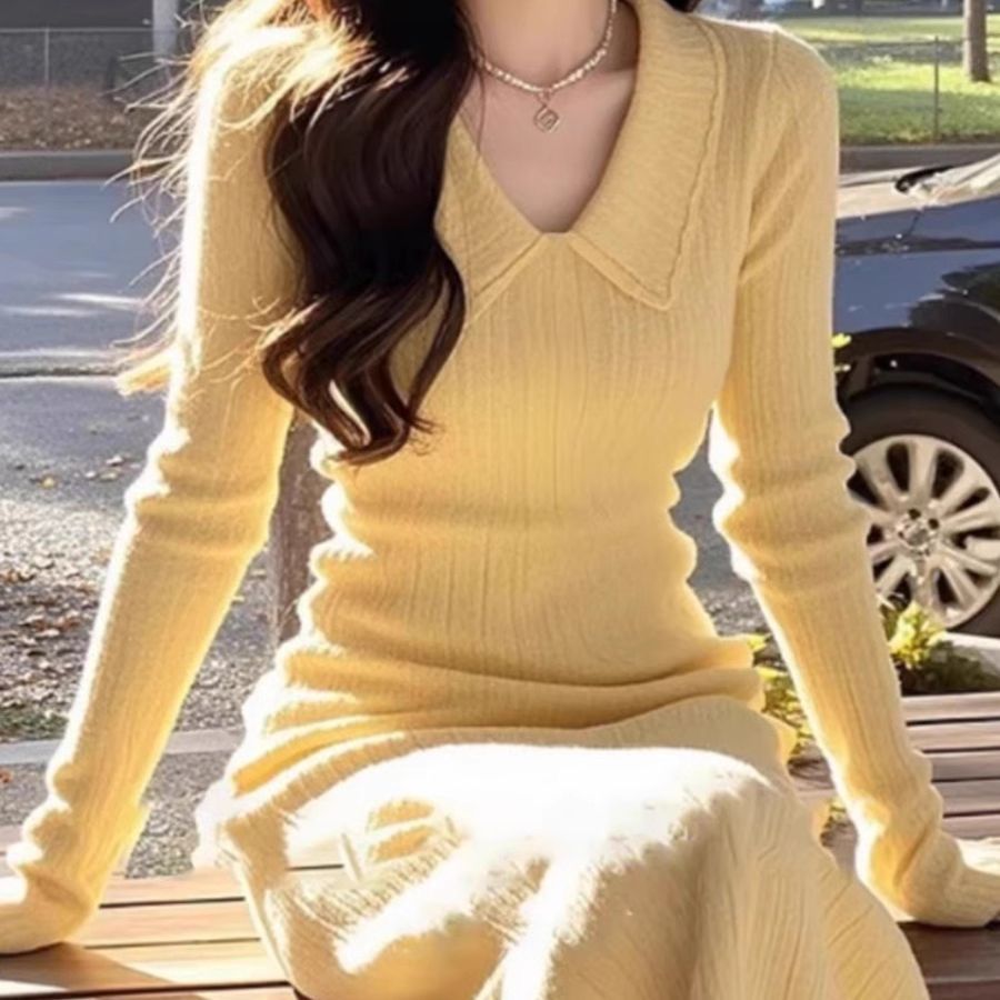 法式黄色针织连衣裙女2025秋冬新款韩系气质修身娃娃领内搭长裙子