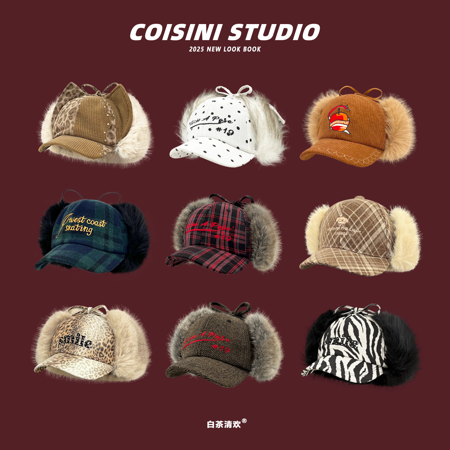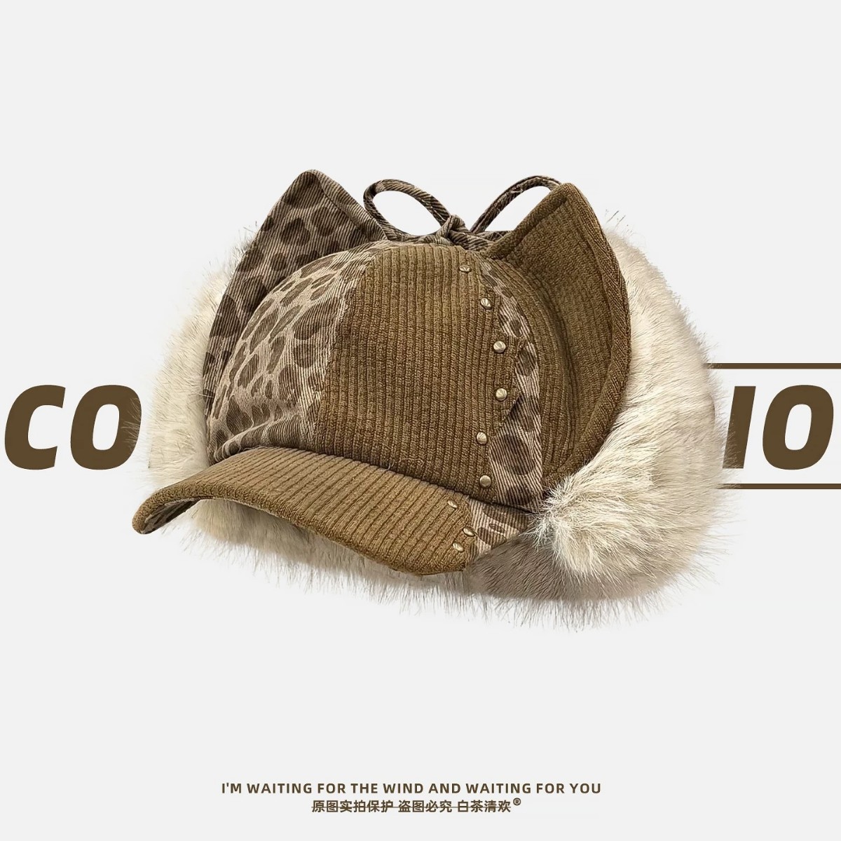 秋冬新款甜酷复古豹纹毛绒猫耳棒球帽子女辣妹护耳加厚保暖鸭舌帽