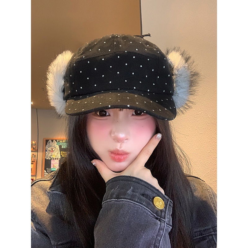 韩系ins波点毛绒护耳鸭舌帽女秋冬季可爱保暖棒球帽甜酷时髦帽子