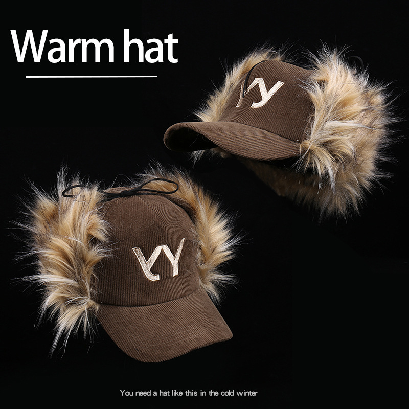 秋冬季新款Yy字母刺绣鸭舌帽防皮草毛绒护耳灯芯绒加厚保暖棒球帽