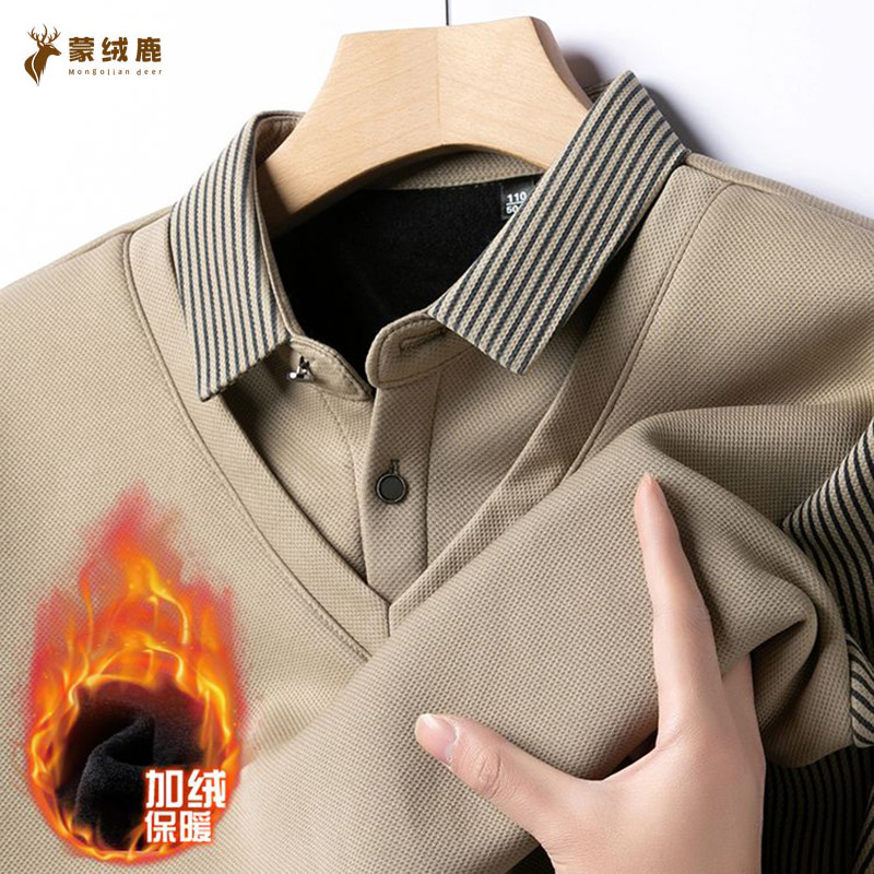 假两件保暖衣秋冬季加绒男士中年男式休闲翻领加厚条纹T恤衫上衣