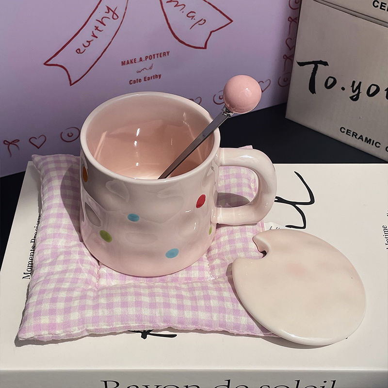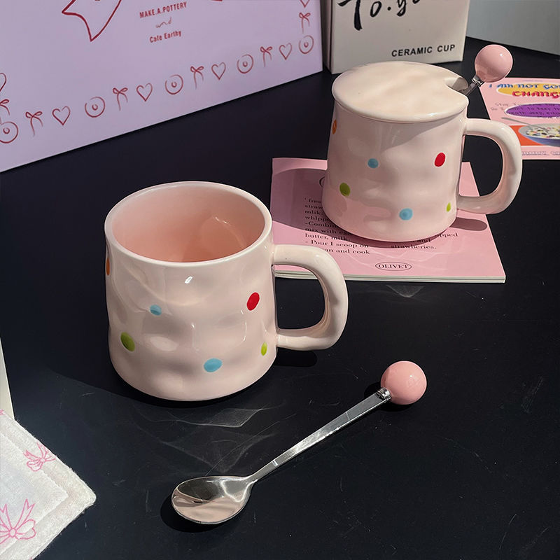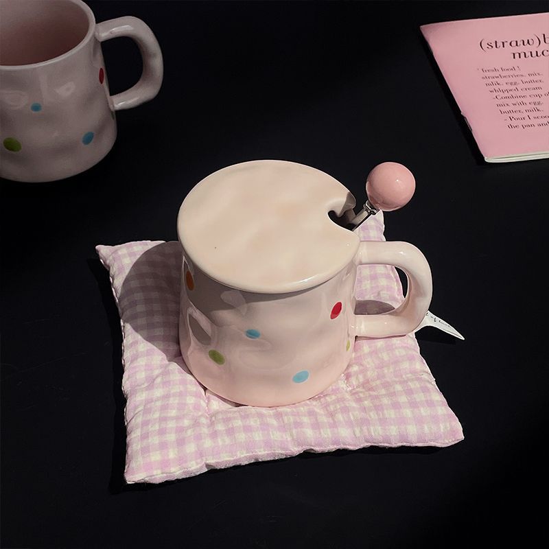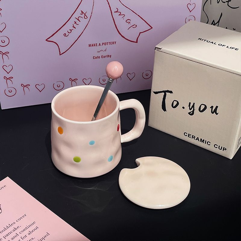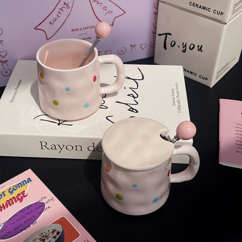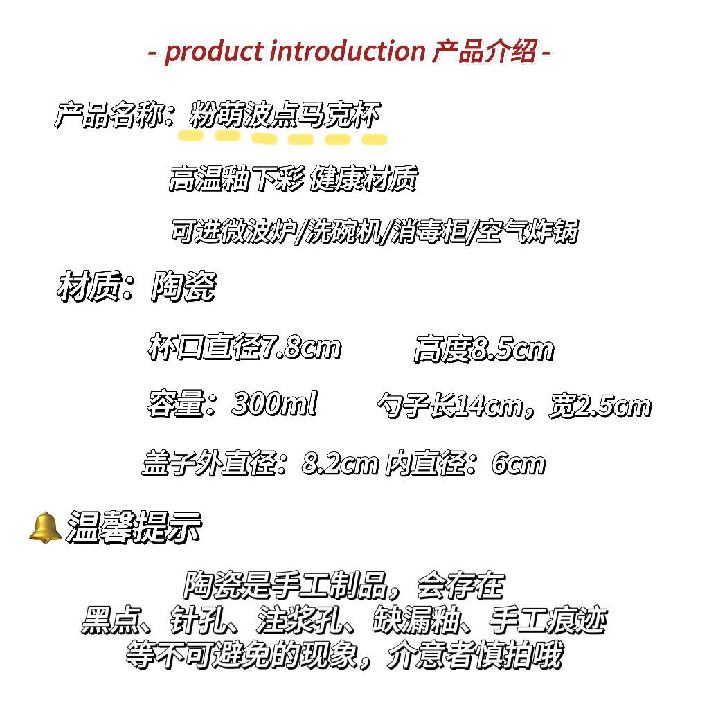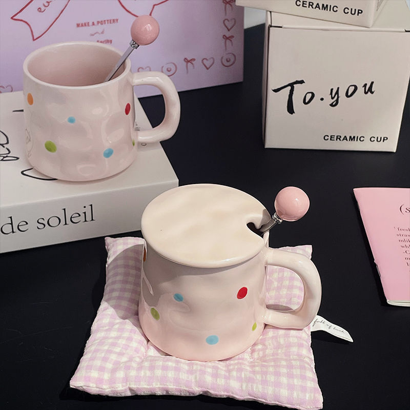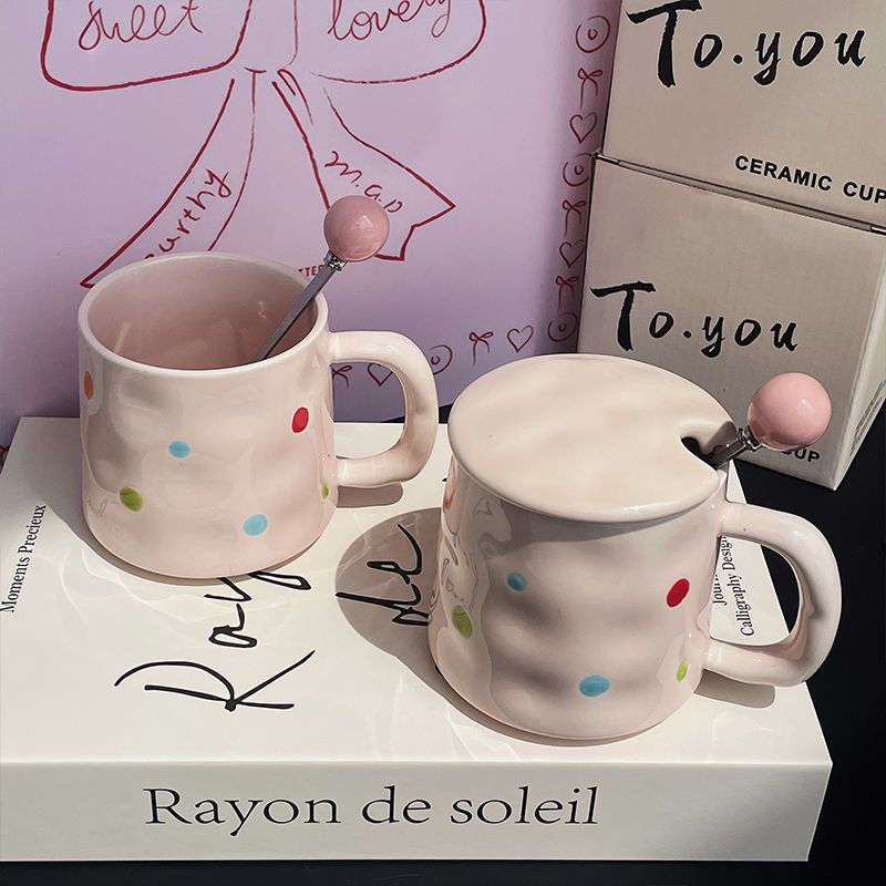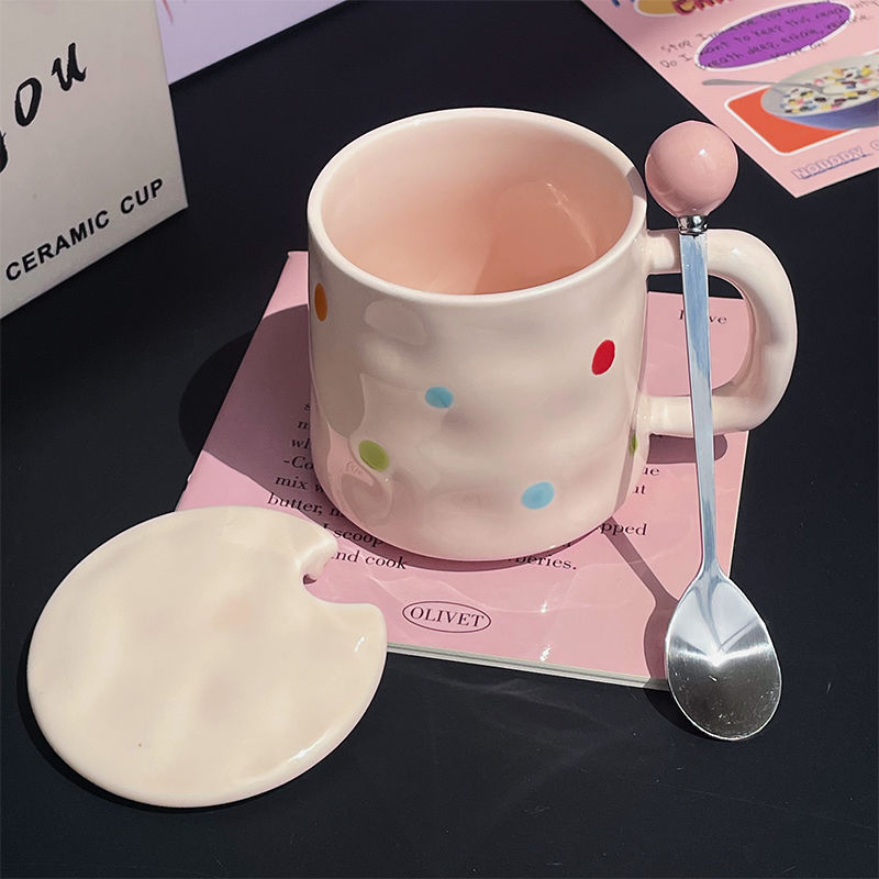 可爱高颜值网红波点马克杯带盖勺陶瓷家用水杯情侣早餐杯子咖啡杯