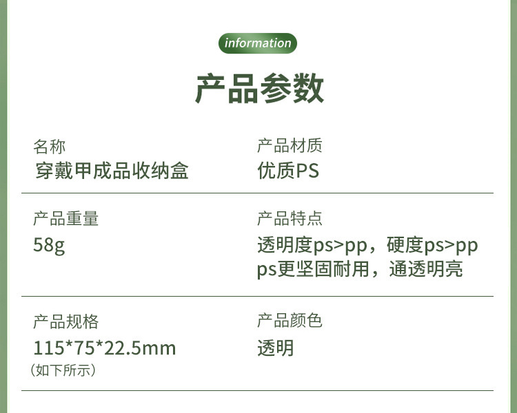 规格 115*75*22mm加高加厚盒子【透明1#58g】,115*75*22mm加高加厚盒子【白底1#58g】,横向加高加厚穿戴甲展示卡【62*120mm】适用1#盒子,106*75*20mm黑目瞳盒子【黑底2#46g】,106*75*20mm黑目瞳盒子【透明2#46g】,800克纹棉纸穿戴甲展示卡【64.5*99mm】适用2#,127*75*14mm长方形盒子【透明3#47g】,127*75*14mm长方形盒子【黑底3#47g】,127*75*14mm长方形盒子【桔粉底3#47g】,10张卡纸62*121mm【适用3#】,100*70*15mm黑目瞳盒子【透明黑底可选】40g