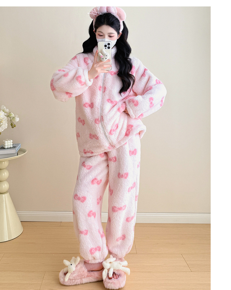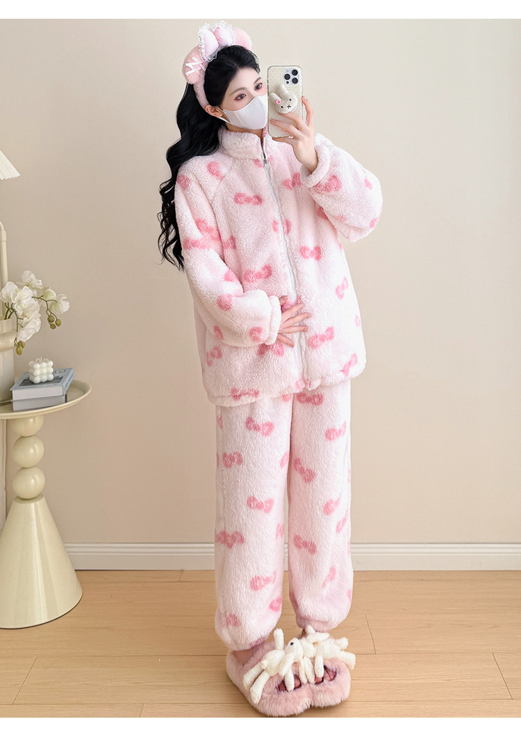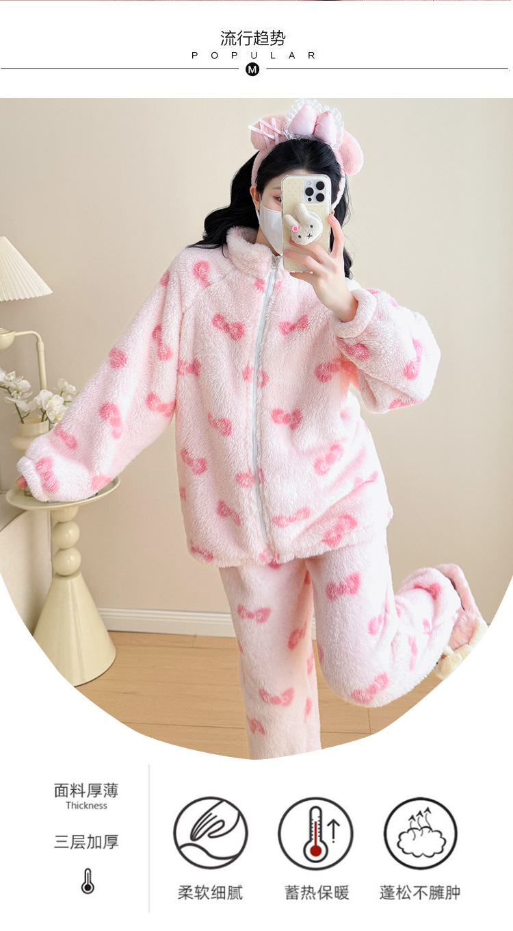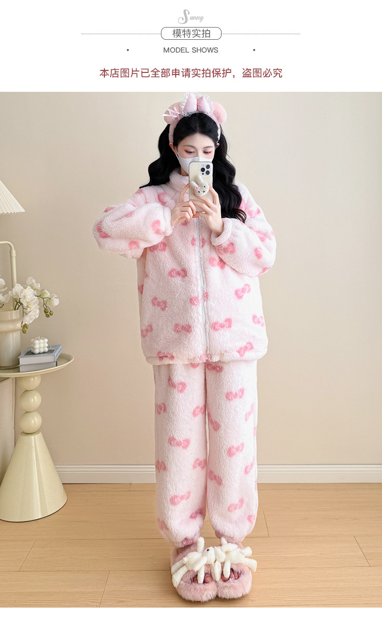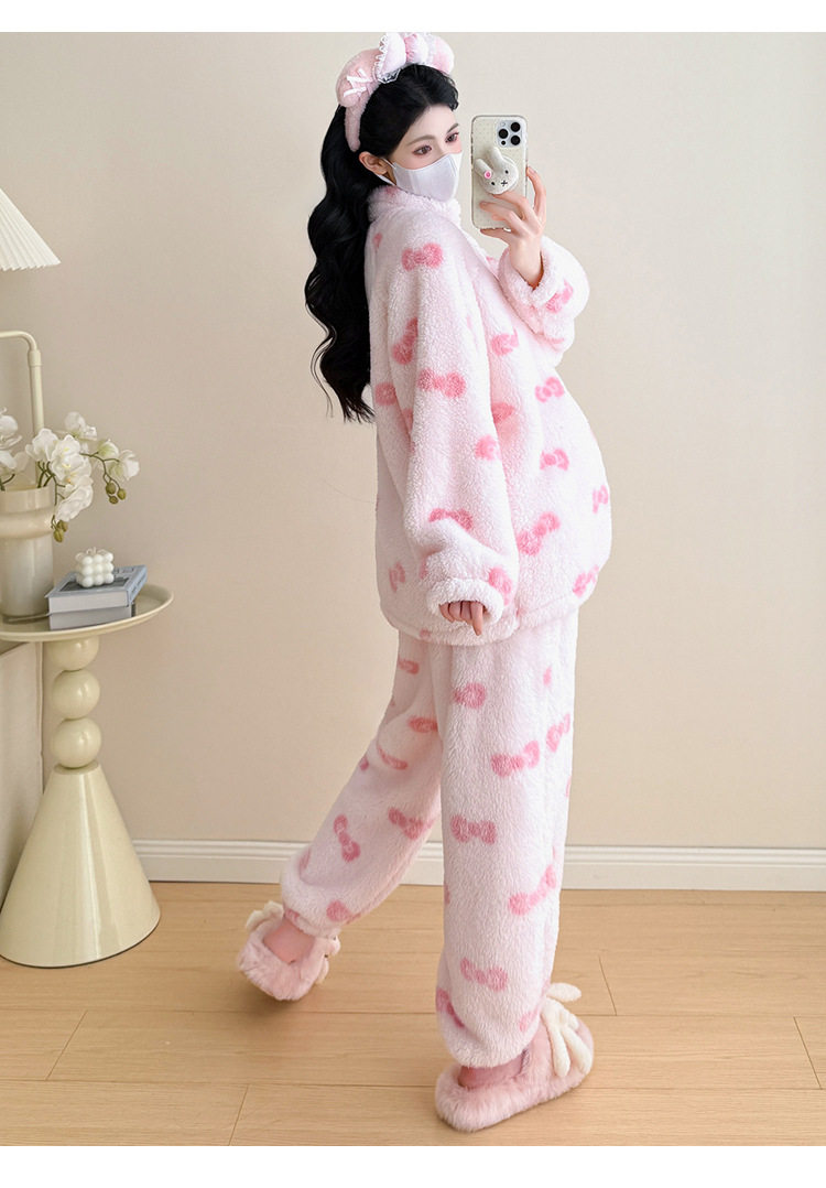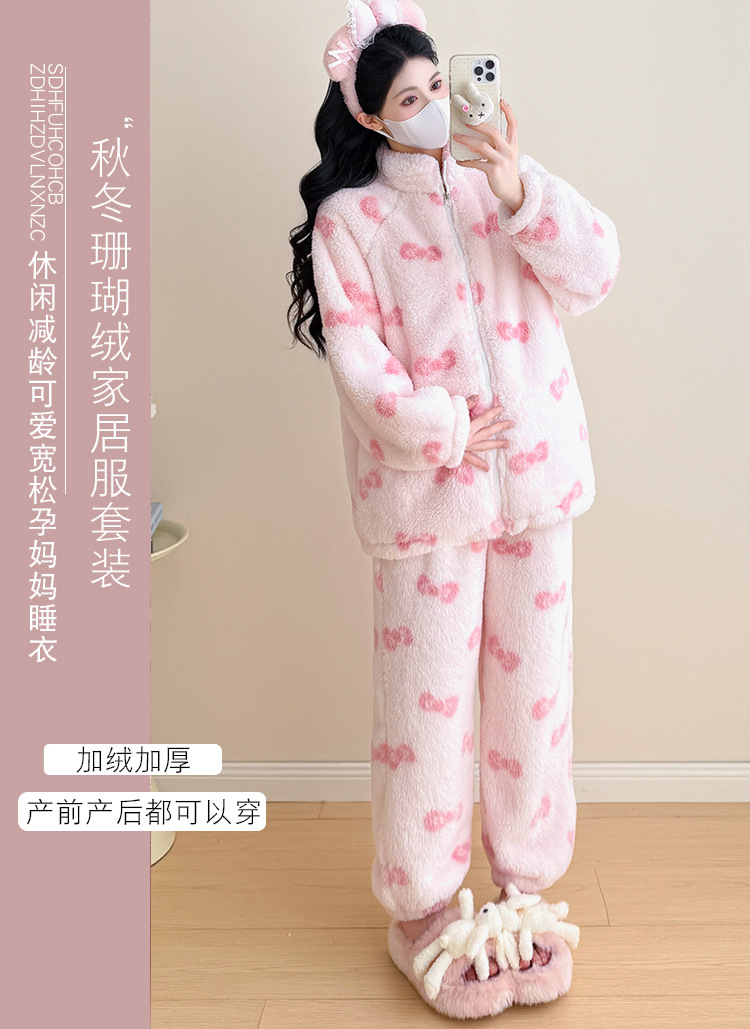 实拍孕妇秋冬粉色蝴蝶结珊瑚绒拉链加绒加厚保暖甜美家居服套装