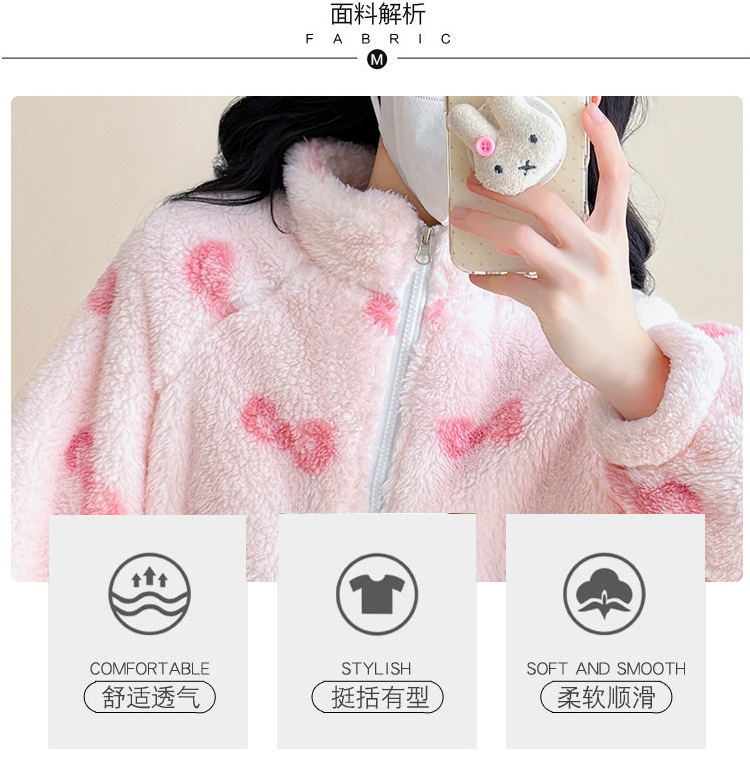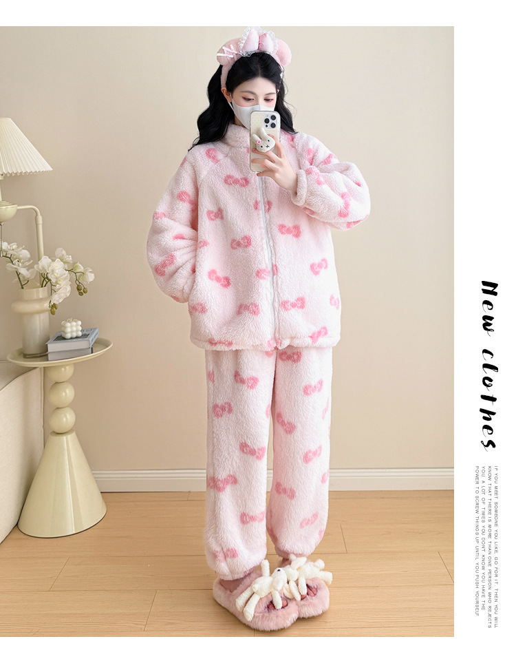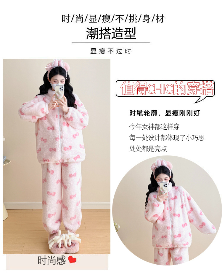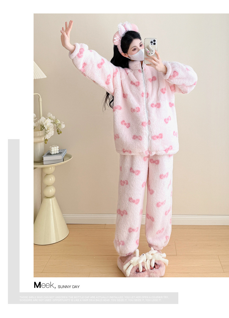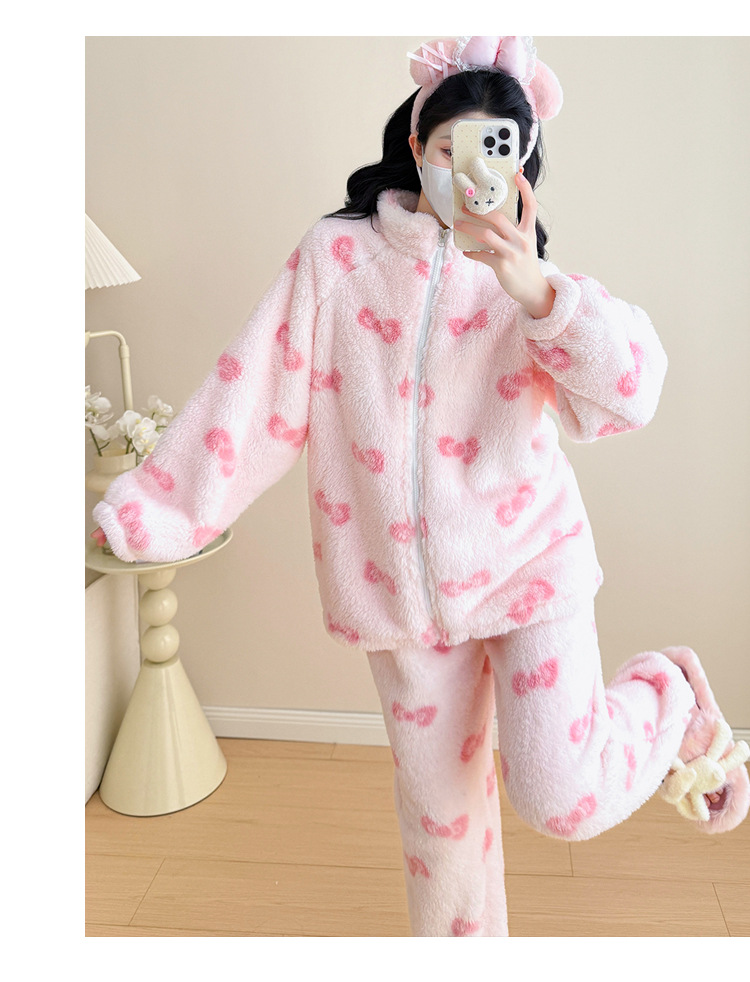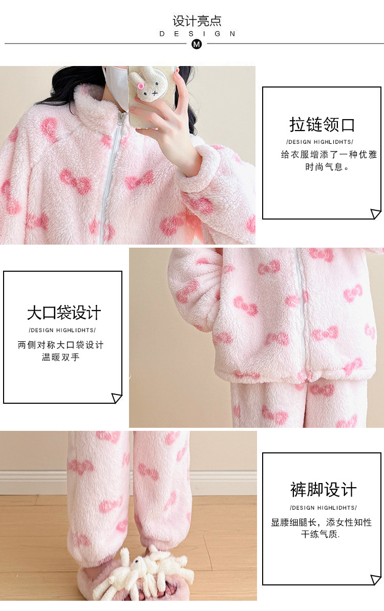 实拍孕妇秋冬粉色蝴蝶结珊瑚绒拉链加绒加厚保暖甜美家居服套装