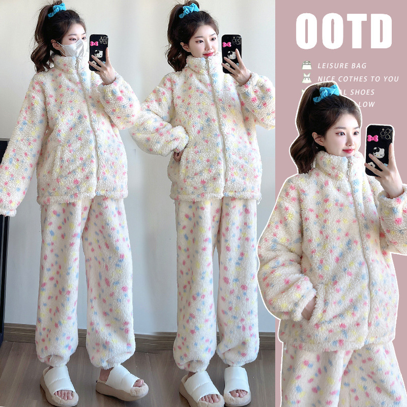 孕妇韩版立领珊瑚绒睡衣女款冬季2025新款加绒加厚家居服套装秋冬