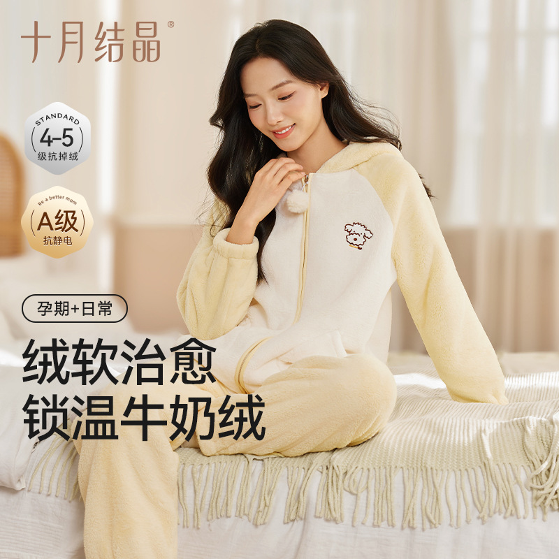十月结晶牛奶绒月子服秋冬季款产后坐月子女怀孕期孕妇连帽家居服