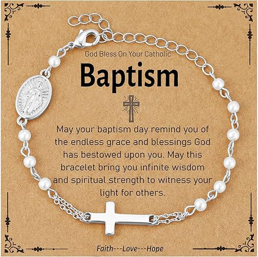 女士白珍珠手链人像吊坠金链条可调节信仰手链珍珠银色十字架手链