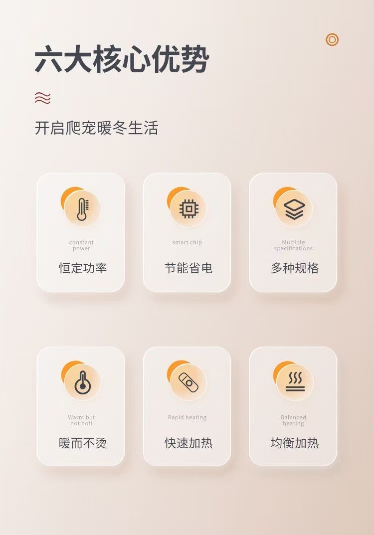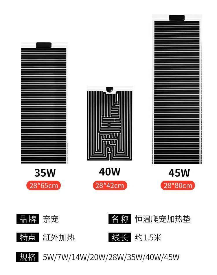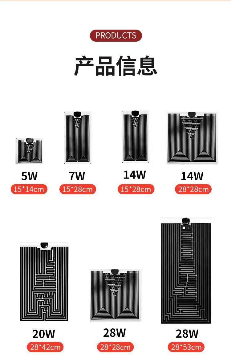 规格 加热垫5W恒温版15*14CM,加热垫7W恒温版15*28CM,加热垫14W恒温版15*28CM,加热垫14W恒温版28*28CM,加热垫20W恒温版28*42CM,加热垫28W恒温版28*28CM,加热垫28W恒温版28*53CM,加热垫35W恒温版28*65CM,加热垫40W恒温版28*42CM,加热垫45W恒温版28*80CM