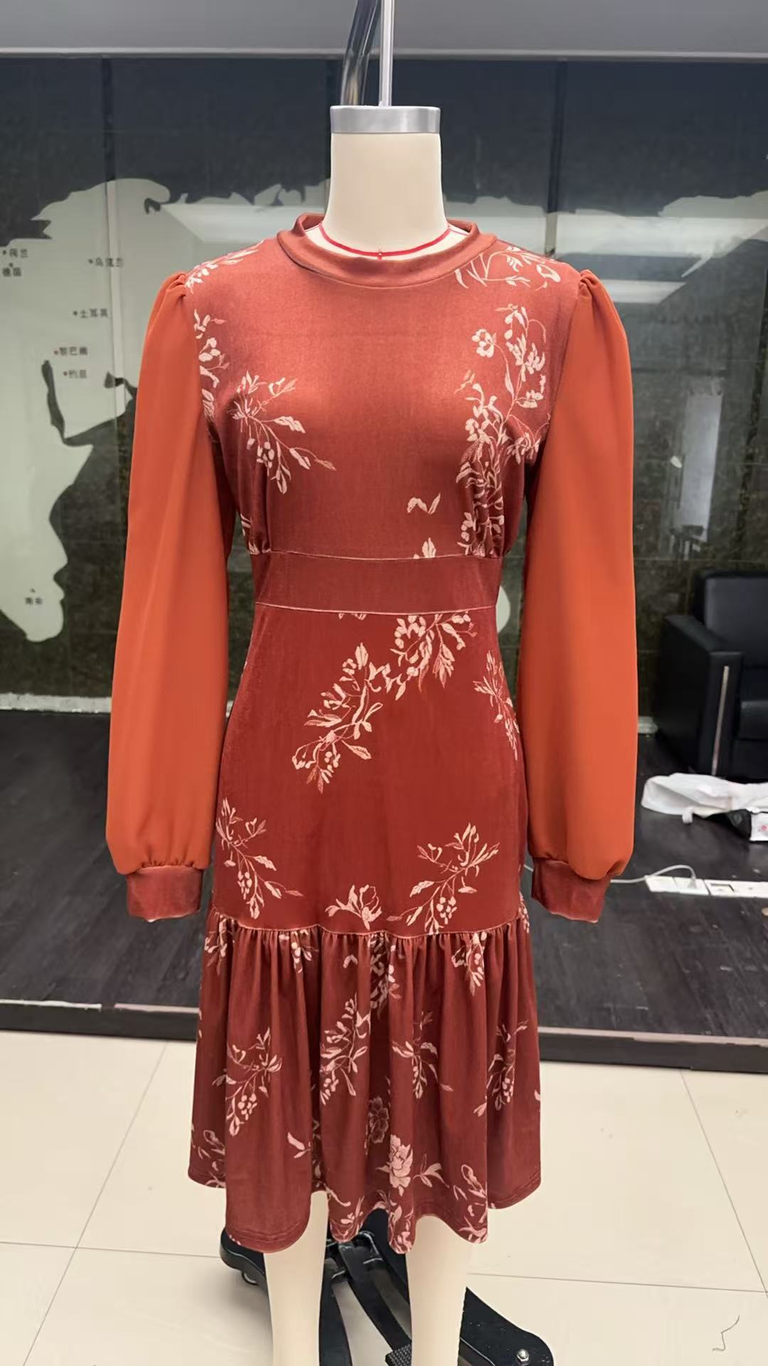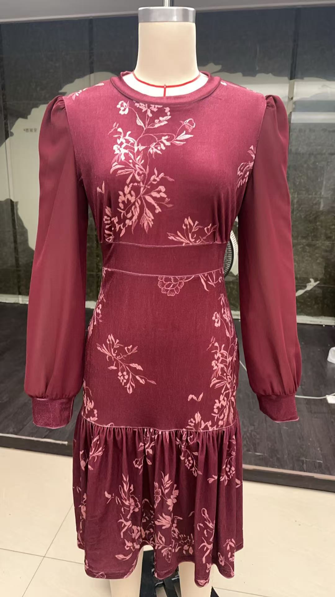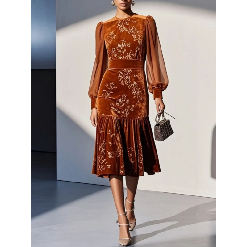 现货 女士秋焦糖色丝绒连衣裙圆领灯笼袖网纱长袖收腰字鱼尾裙