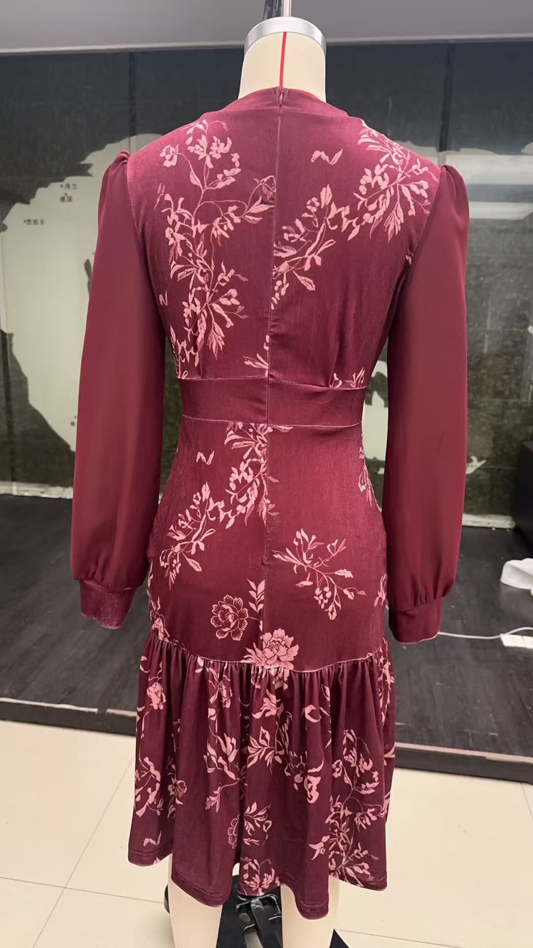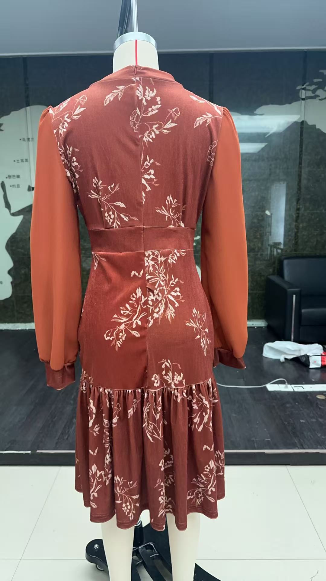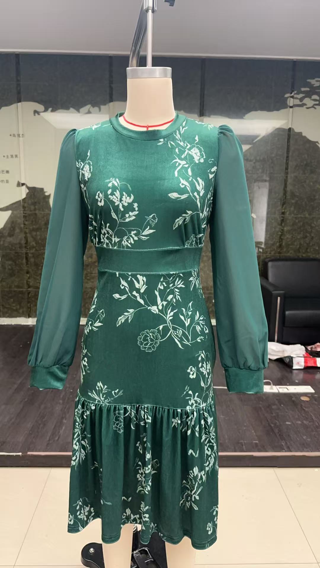 现货 女士秋焦糖色丝绒连衣裙圆领灯笼袖网纱长袖收腰字鱼尾裙
