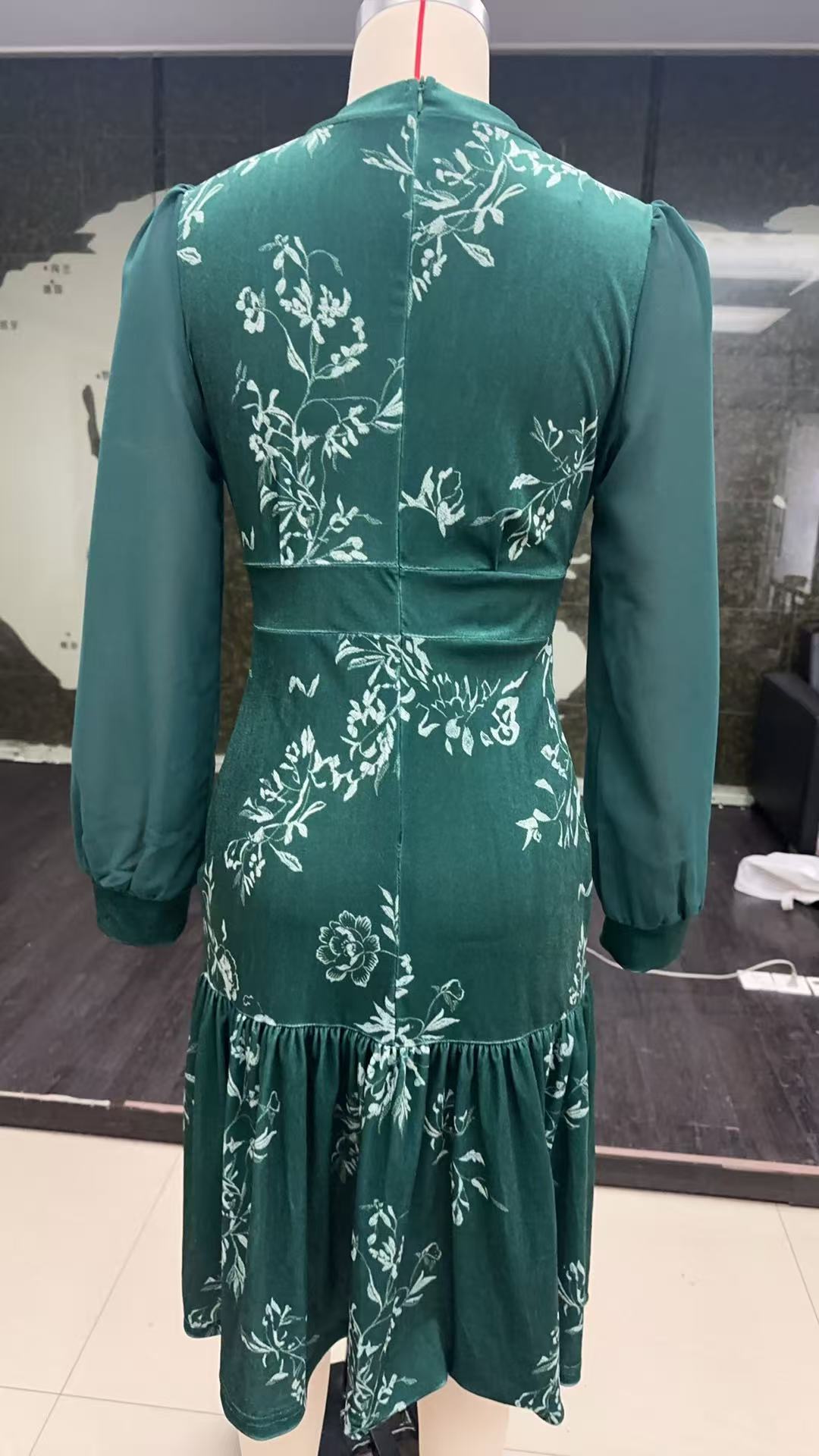 亚马逊独立站秋冬新品 午夜丝绒水钻长袖中长裙配羽毛袖口