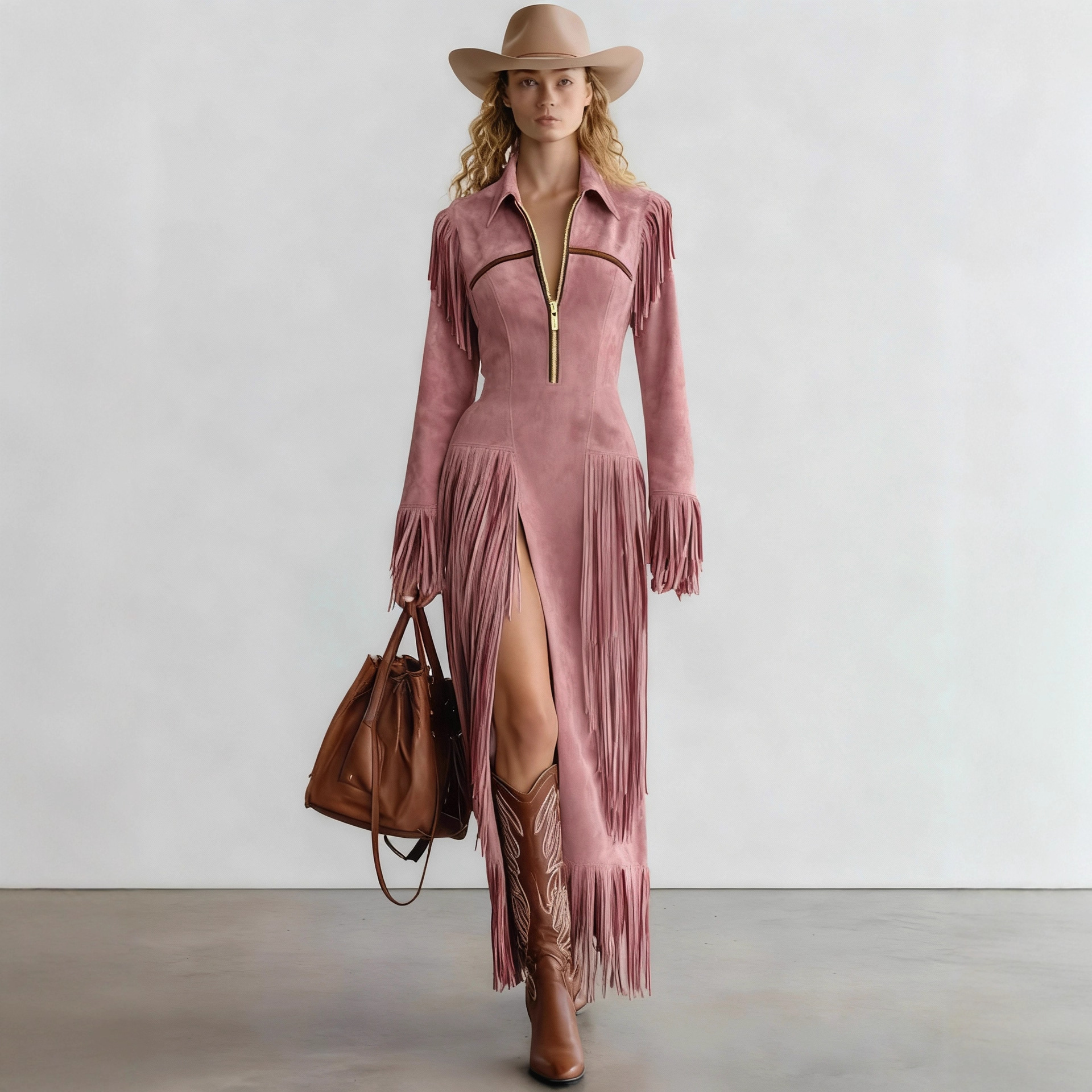 2025新款欧美亚马逊爆款跨境西部牛仔风麂皮流苏修身长袖连衣裙