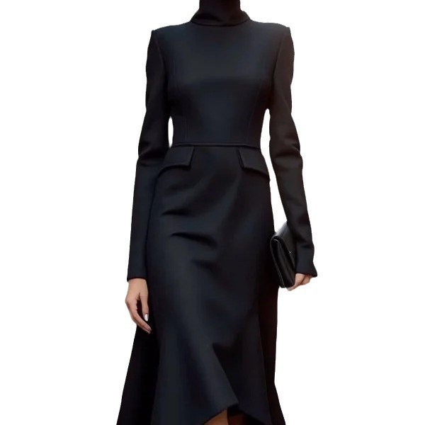 2025欧码女装 亚马逊 独立站 秋装纯色 长袖交叉 高领 连衣裙长裙