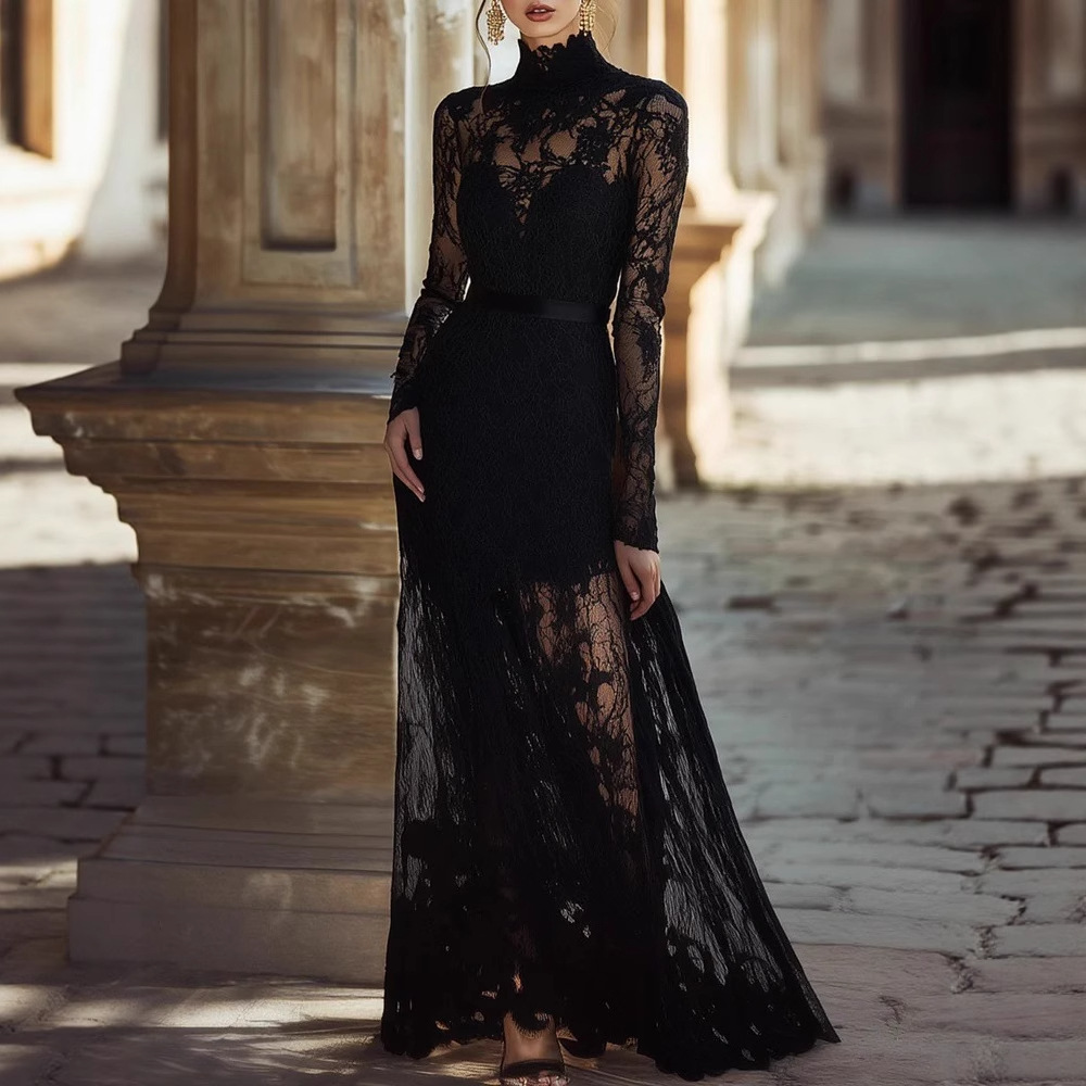 女士纯色镂空复古立领长袖蕾丝大摆收腰显瘦高级感时尚连衣裙
