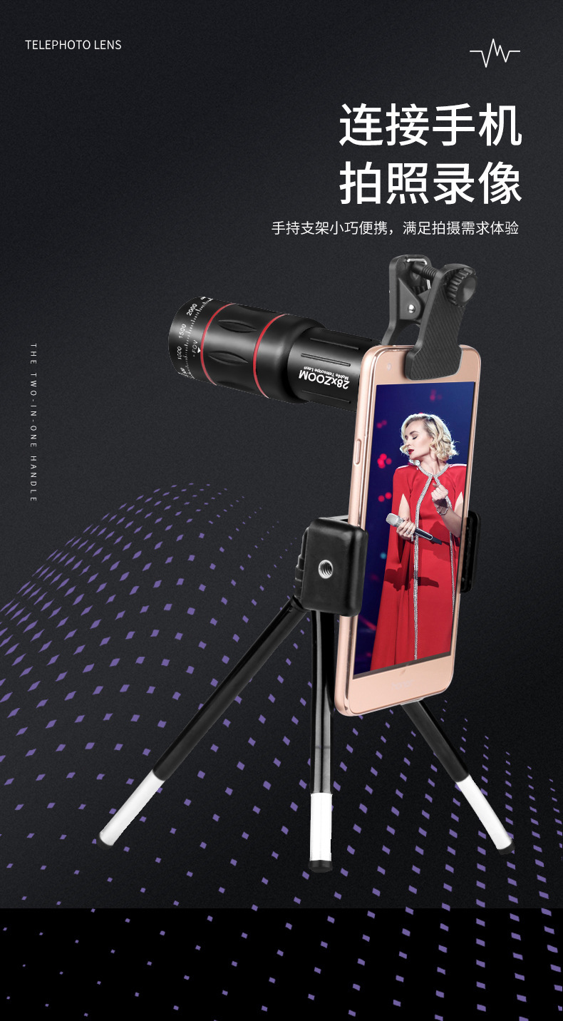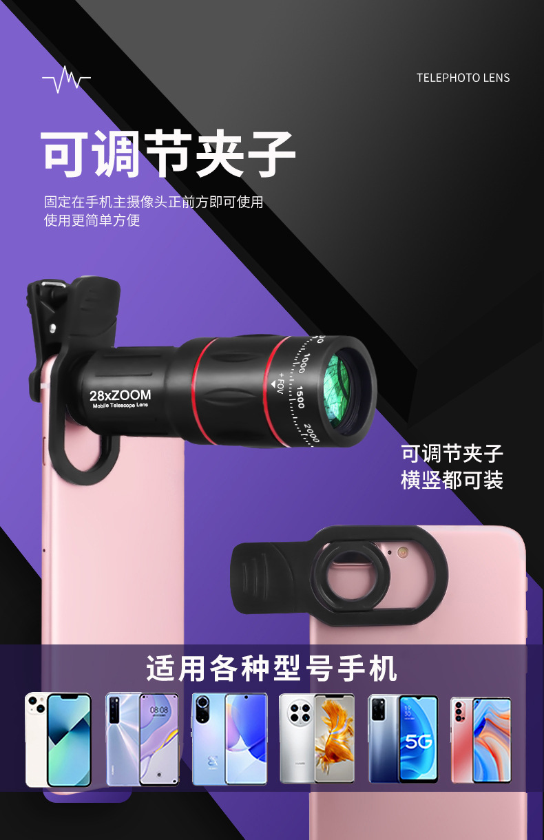 铝合金全套:手机镜头+可调节猫夹+眼罩+前后镜头盖+E型夹+铝合金伸缩支架+擦镜布+彩盒 重量:225g 彩盒:9*6.6*16.5cm 箱规:50个/箱 51*38*37cm 12.1kg