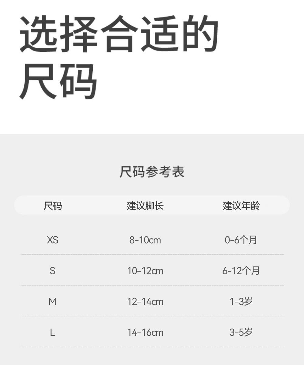 童袜尺码 0-6月【建议脚长8-10cm】,6-12月【建议脚长10-12cm】,1-3岁【建议脚长12-14cm】,3-5岁【建议脚长14-16cm】