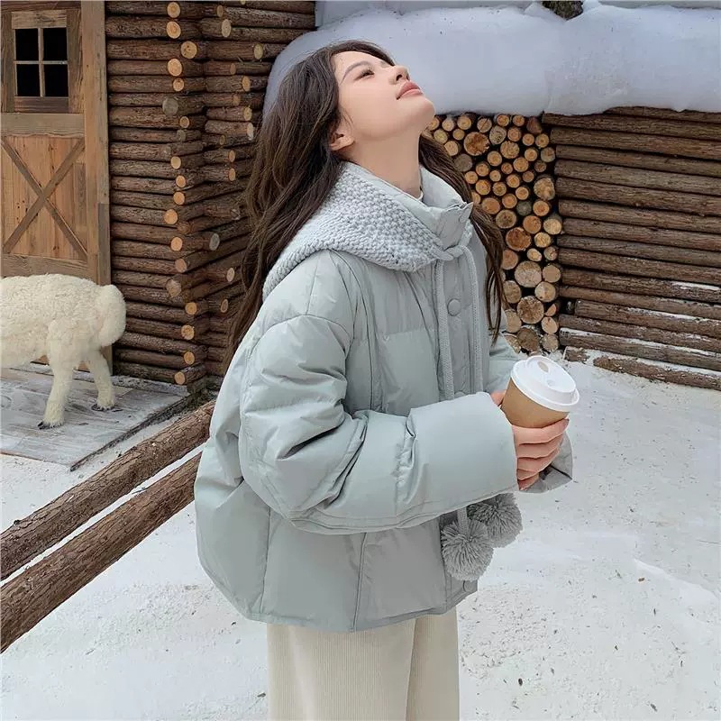 针织毛球帽羽绒服女短款2025冬季甜美加厚小个子保暖白鸭绒面包服