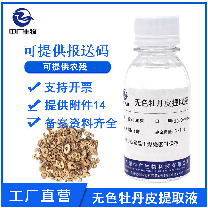 中広生物無色牡丹皮抽出液植物化粧品スキンケア原料牡丹根皮エキス100g