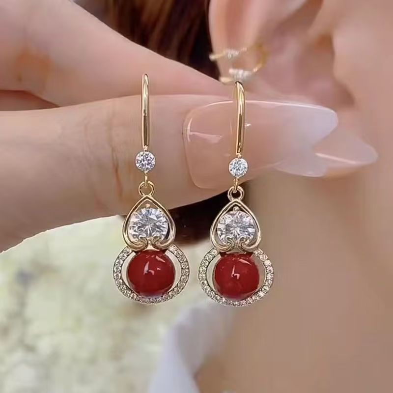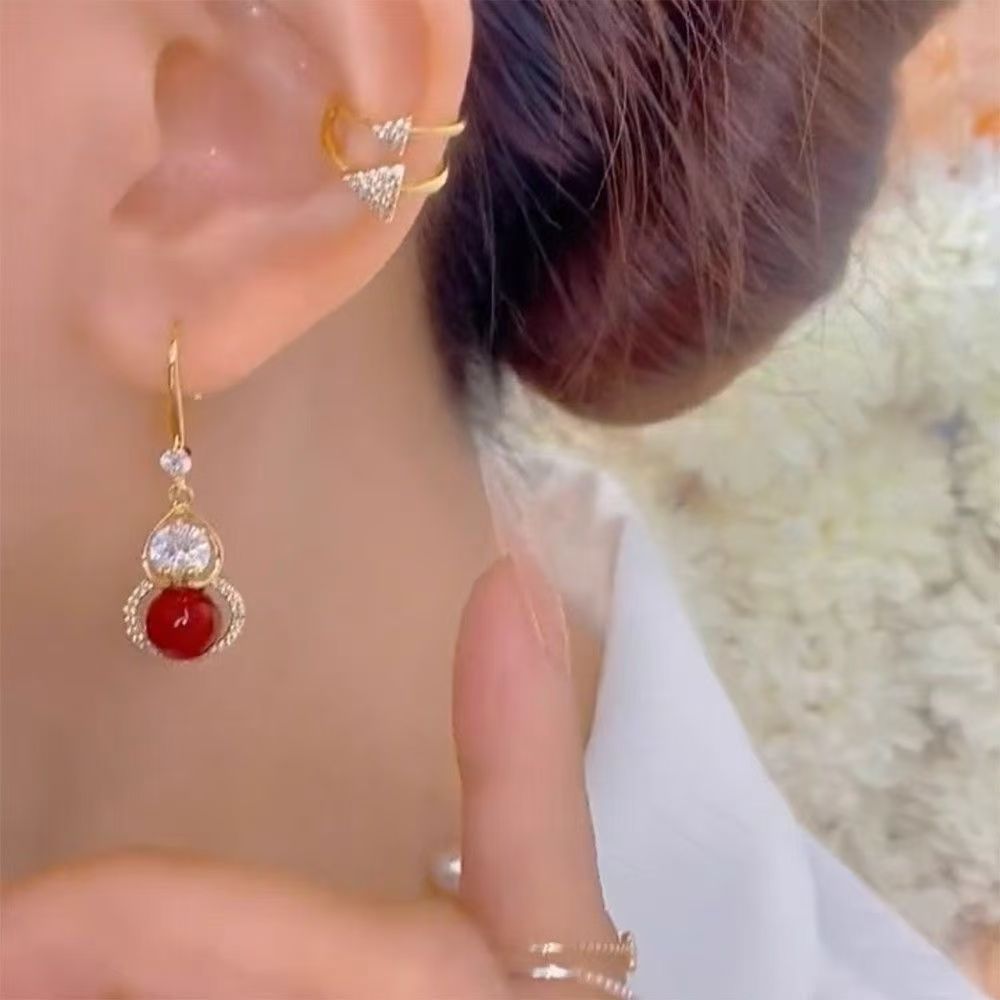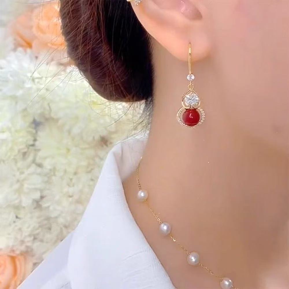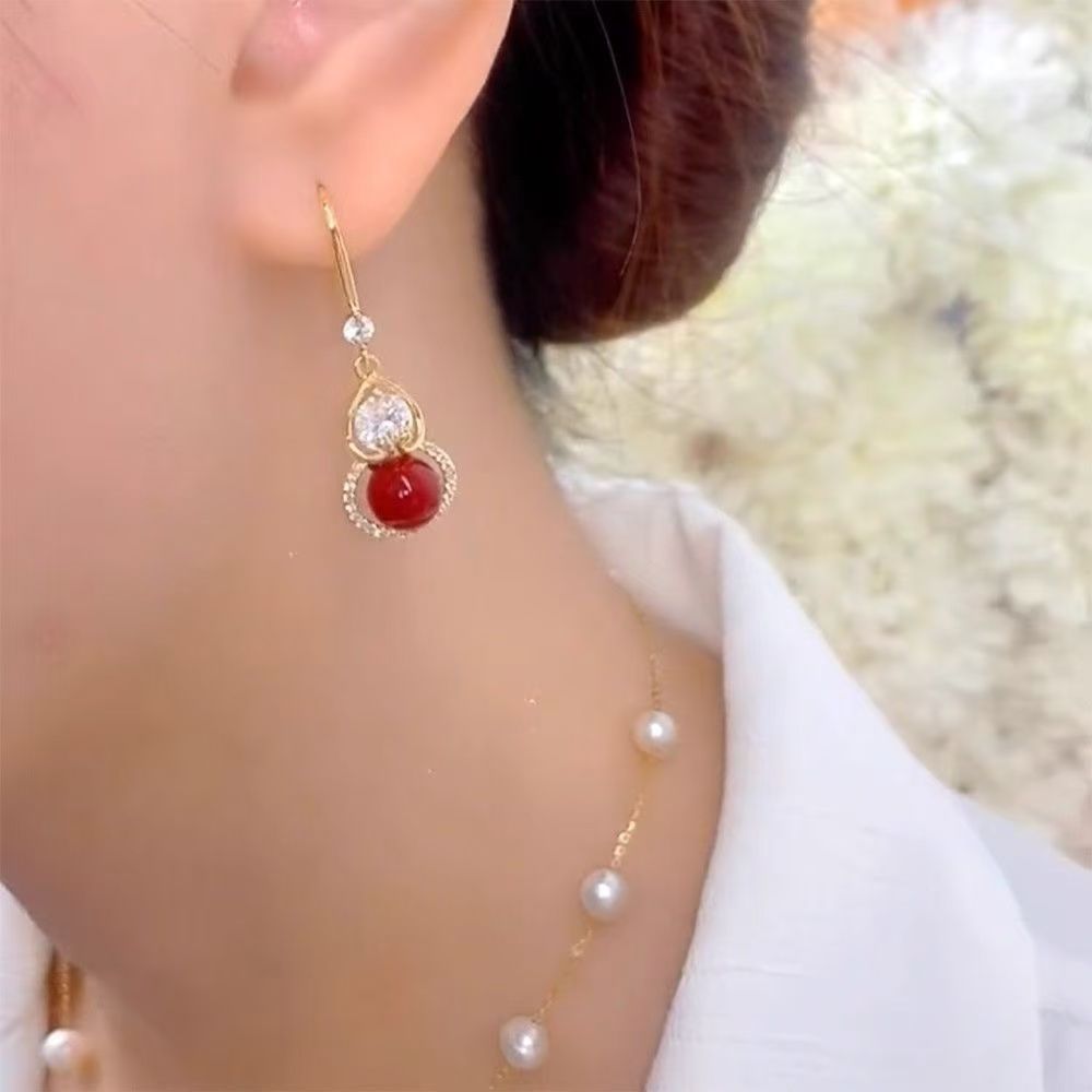 2025年新款中国风复古红色珍珠镶钻葫芦锆石耳环女高级感喜庆耳饰