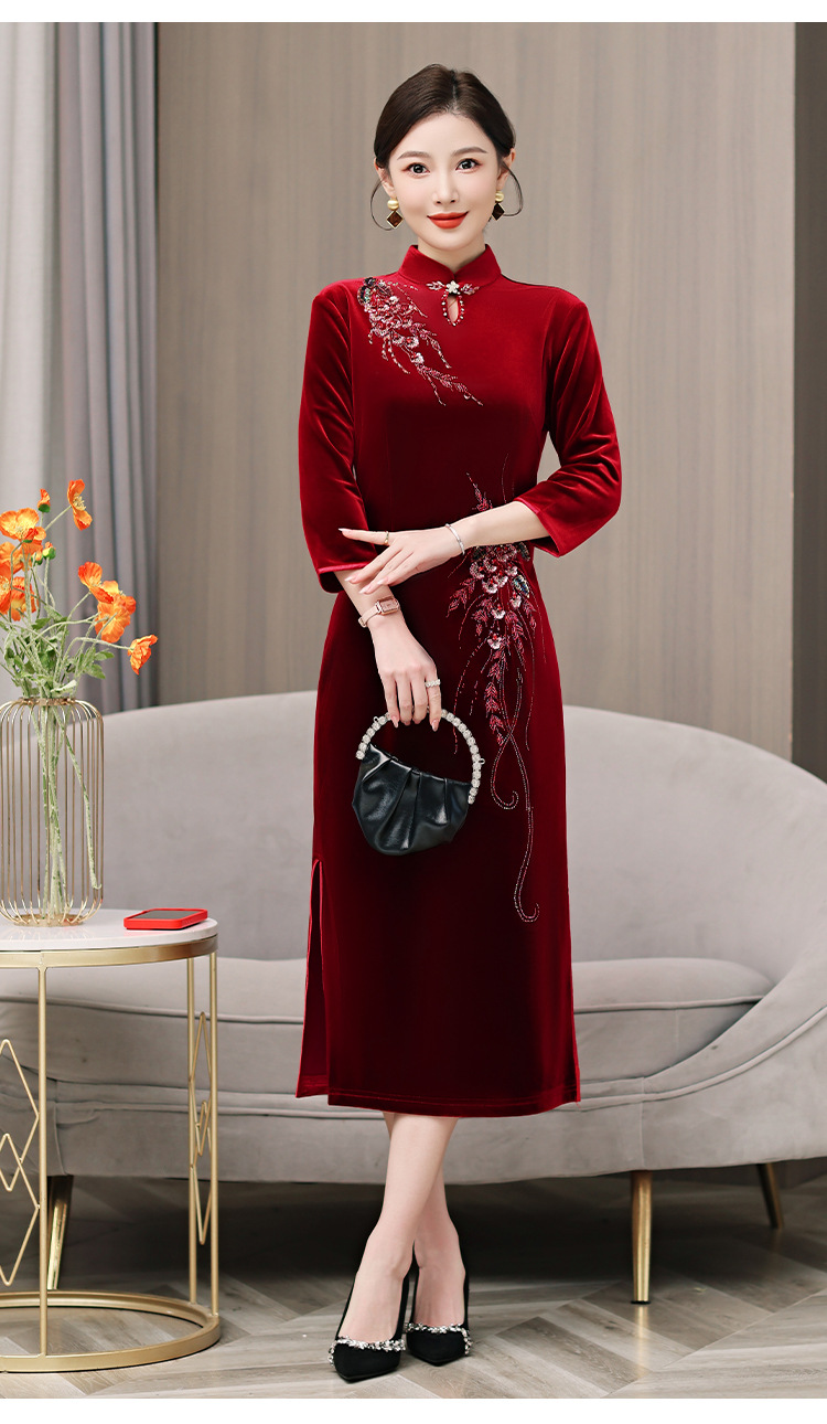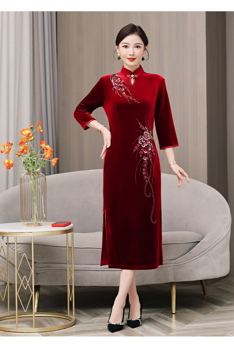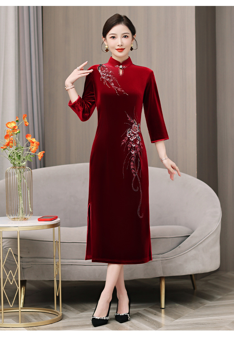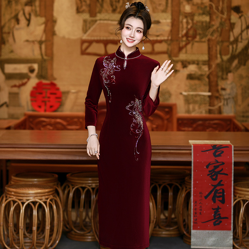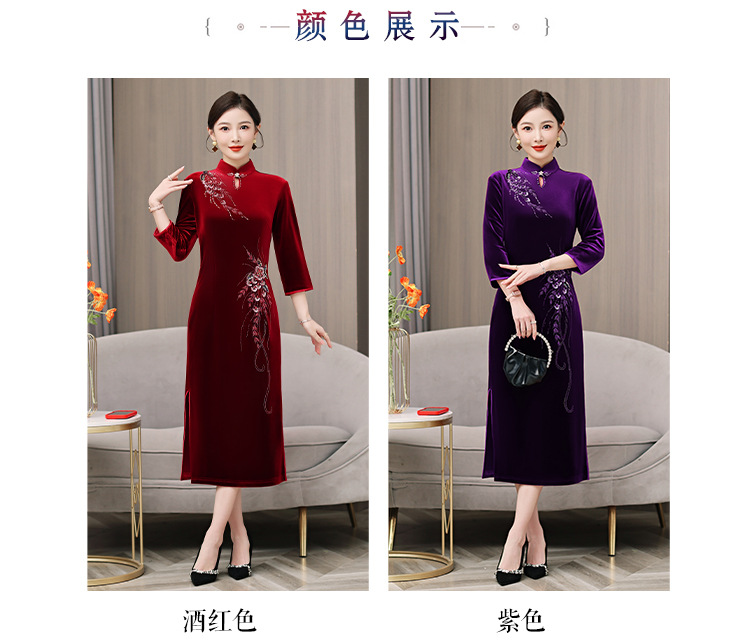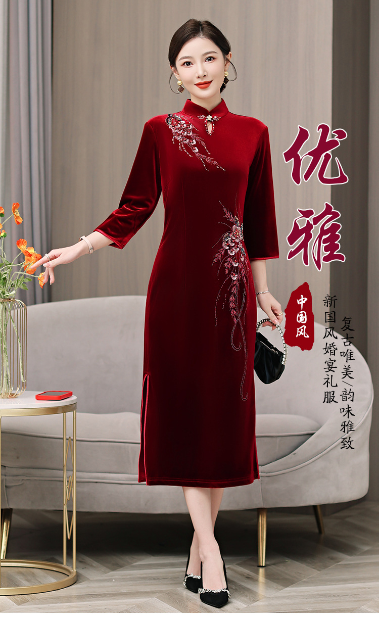 秋冬礼服中年旗袍女婚礼妈妈装喜婆婆婚宴装高贵金丝绒连衣裙高端