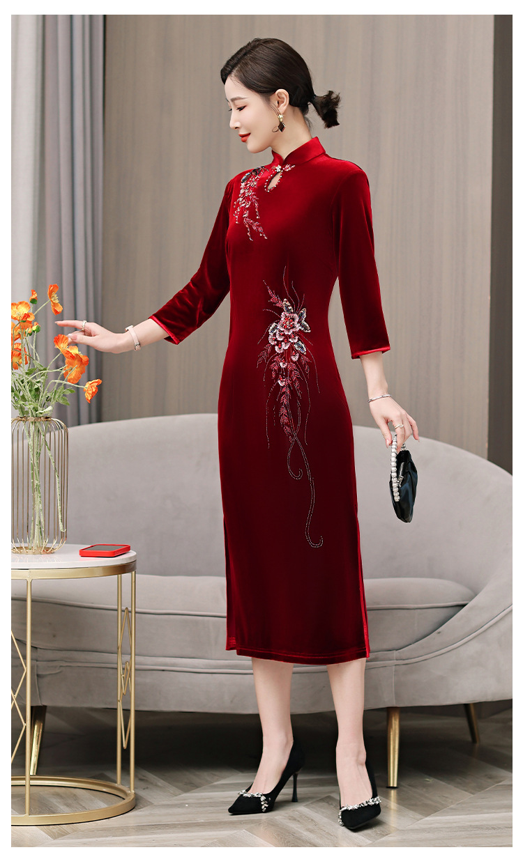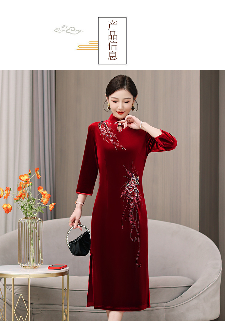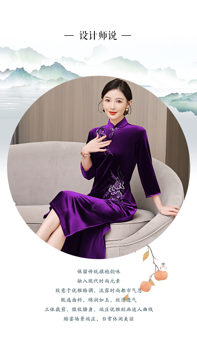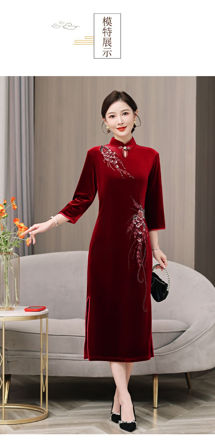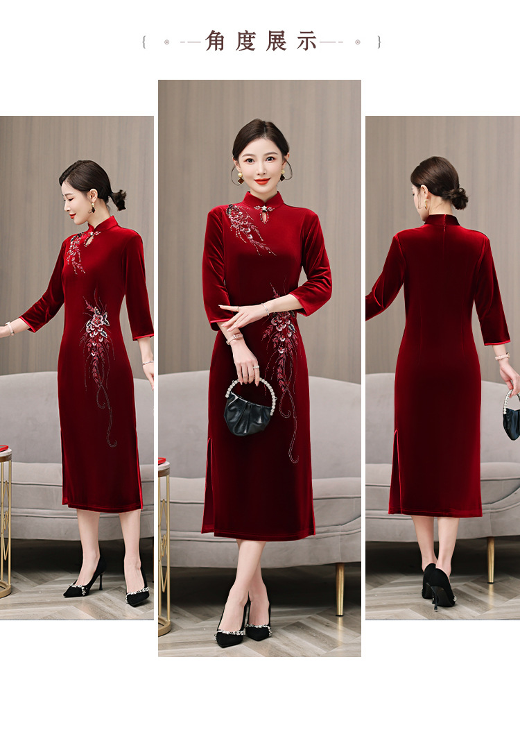 秋冬礼服中年旗袍女婚礼妈妈装喜婆婆婚宴装高贵金丝绒连衣裙高端