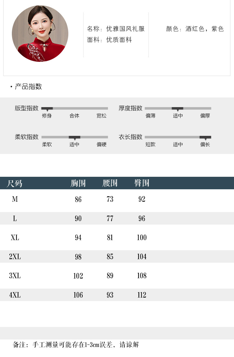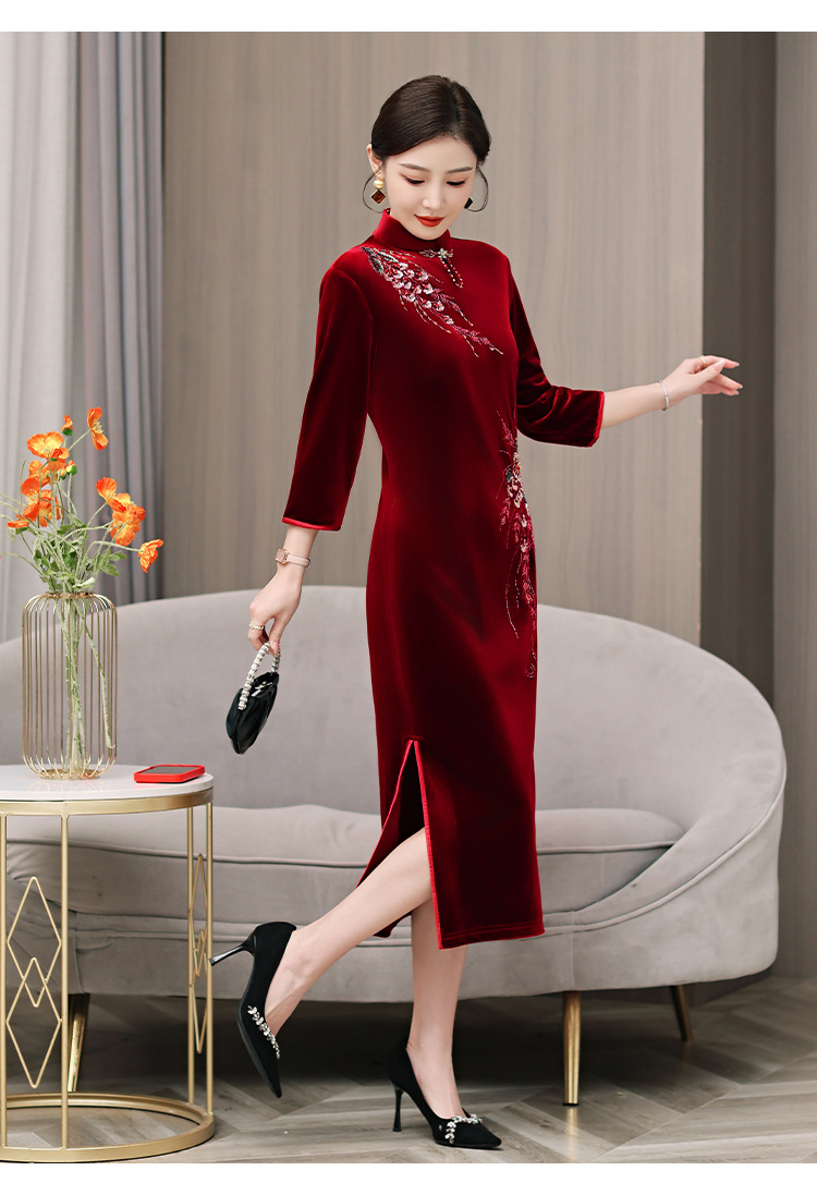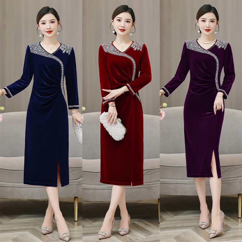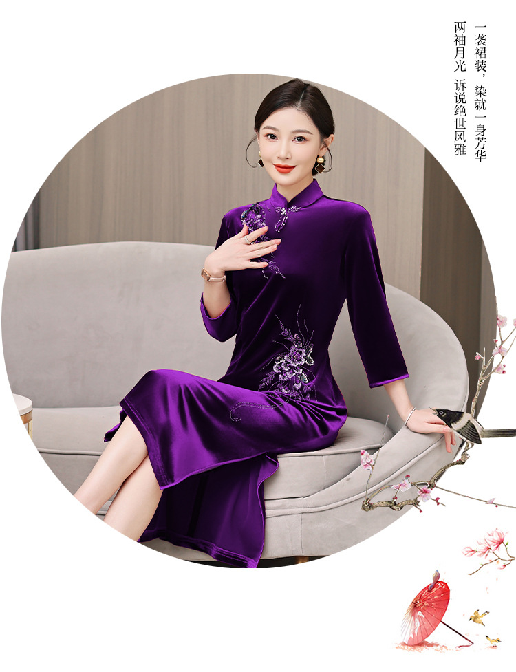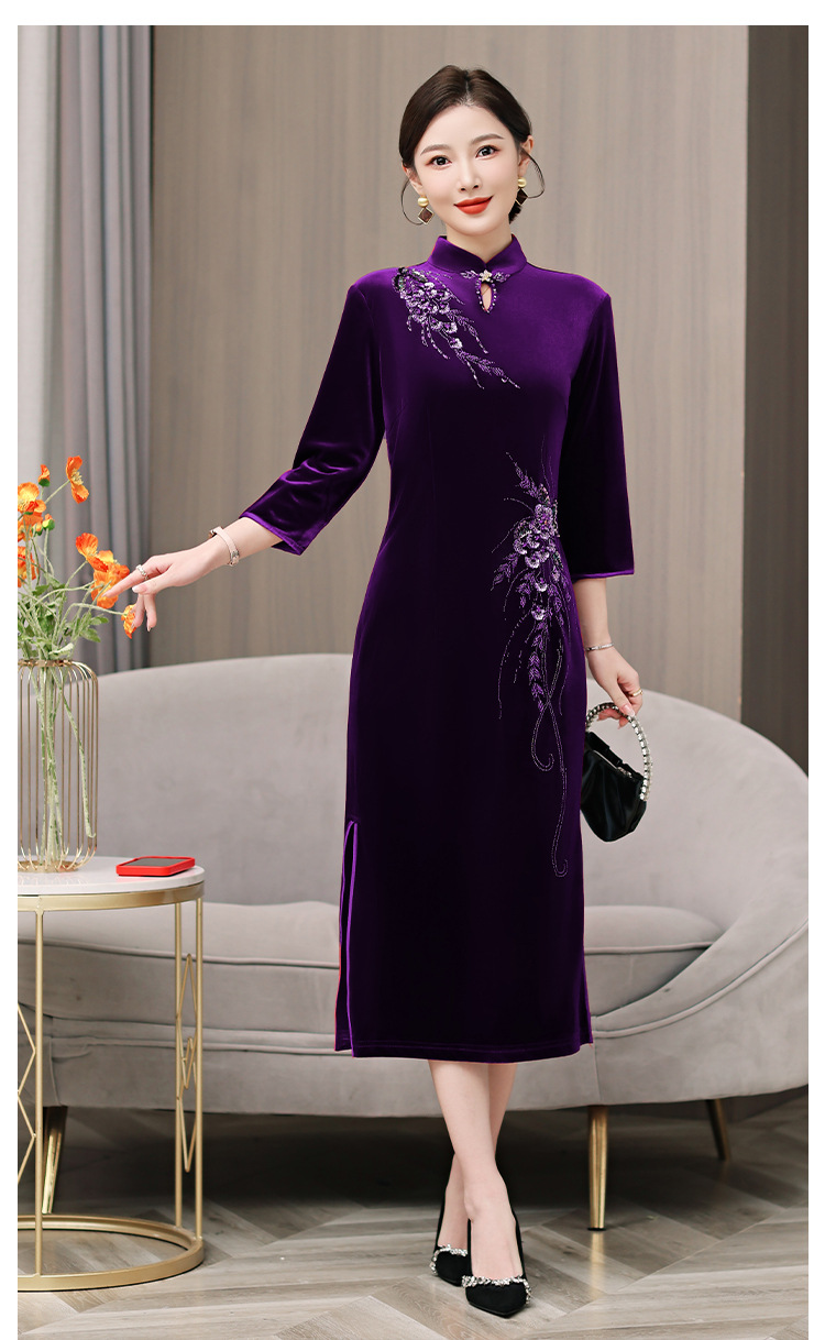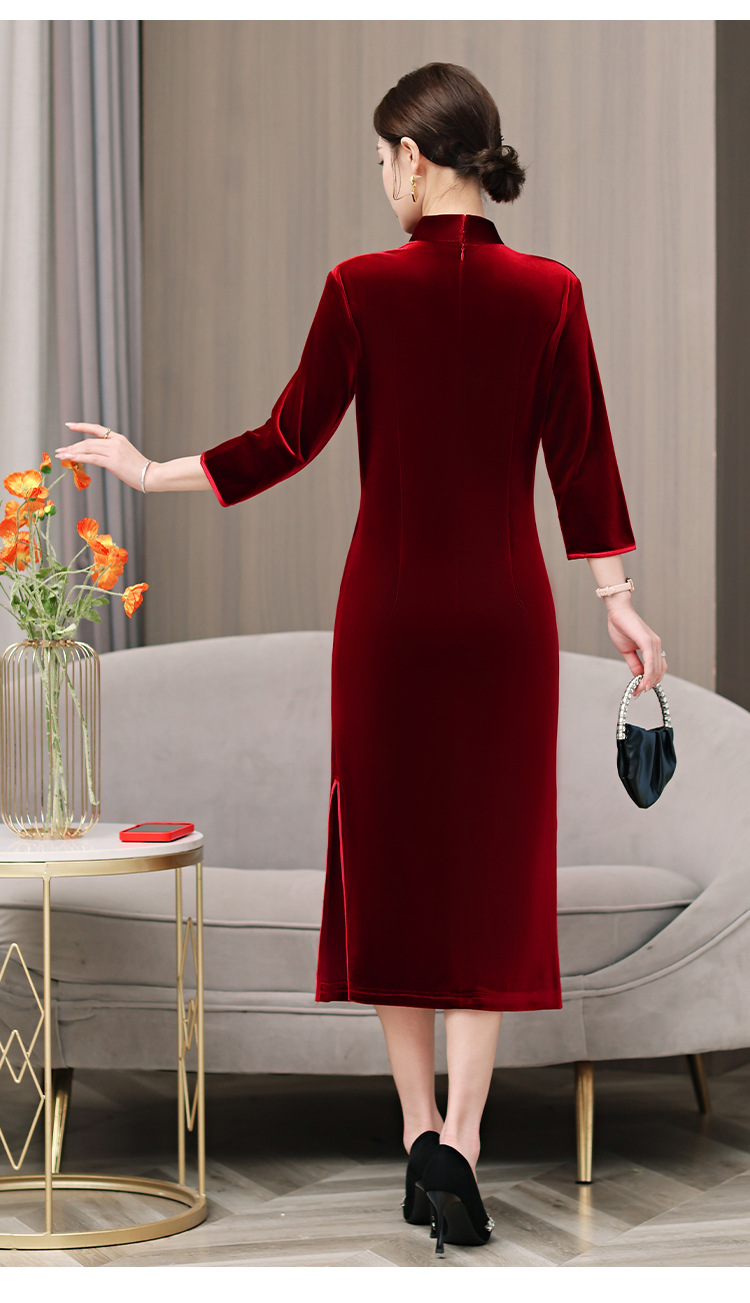 秋冬礼服中年旗袍女婚礼妈妈装喜婆婆婚宴装高贵金丝绒连衣裙高端
