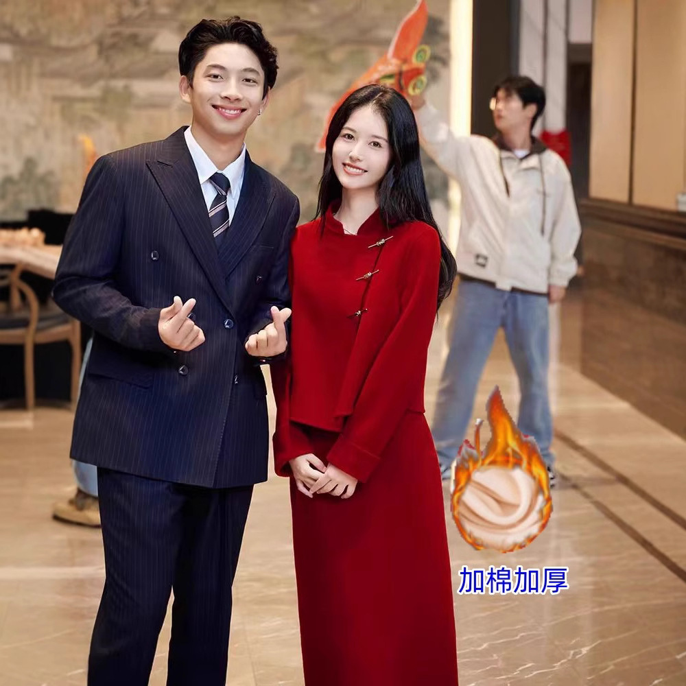 婚約ドレスの毛は、国風秋冬新中国式の赤い上着の2つのセットの婚約領収書のチャイナドレスのドレスのドレスです。
