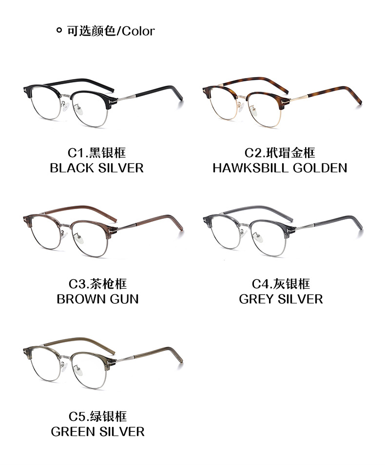镜框颜色 黑银C1,玳瑁金C2,褐色茶C3,明灰银C4,橄榄绿银C5