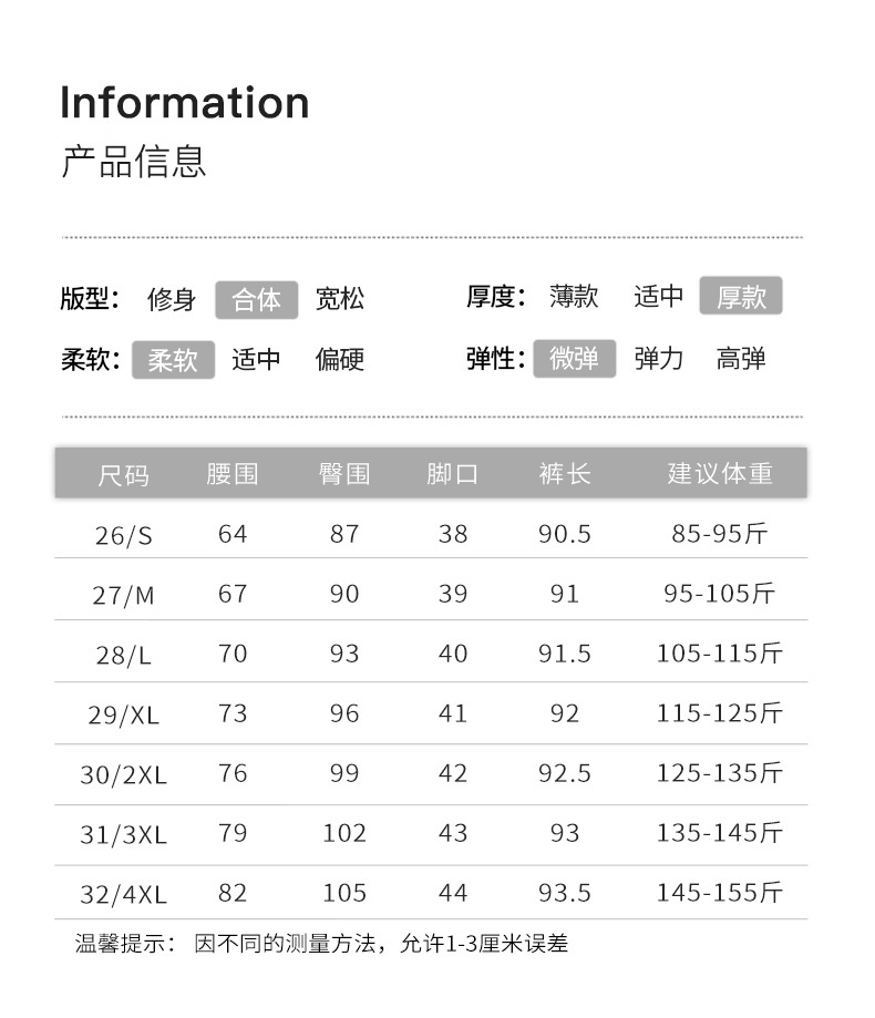 尺码 26/S,27/M,28/L,29/XL,30/2XL,31/3XL,32/4XL
