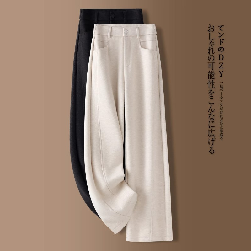 米白色のカシミヤストレートパンツ レディース 秋冬2025新作 ハイウエスト カジュアル 裏起毛 ライスパンツ ウール混 ワイドパンツ
