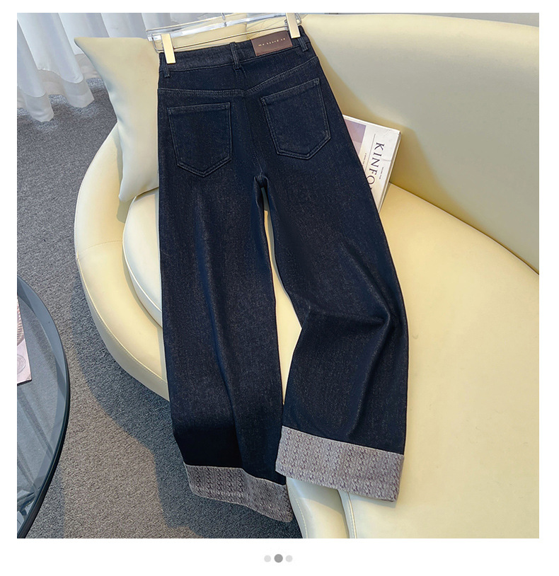 2025年ハイウエストゆったり裏起毛九分丈ストレートパンツ レトロダークブルーワイドレッグジーンズ レディース 秋冬通勤スタイル