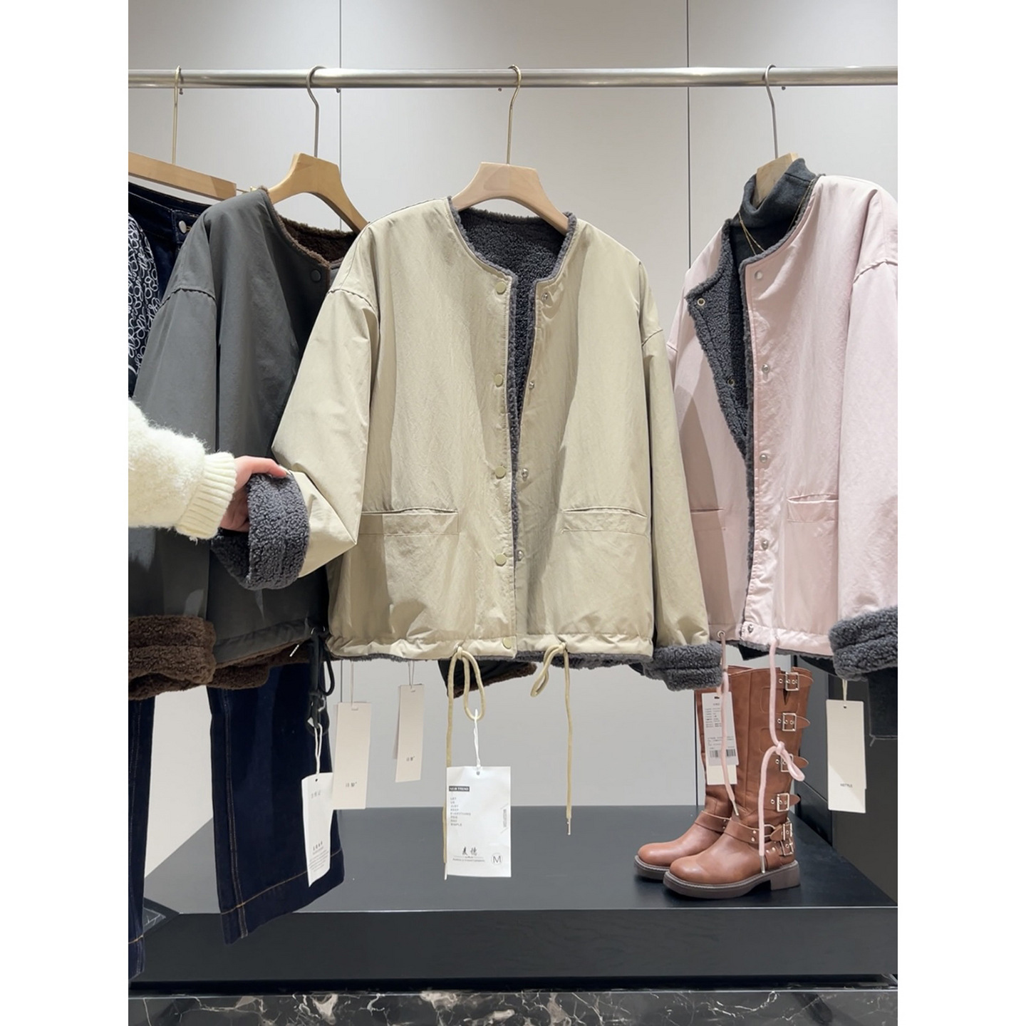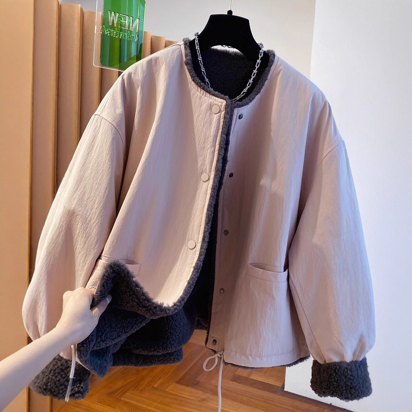 两面可穿!韩系气质简约圆领下摆抽绳时髦短款糕糕毛保暖上衣外套