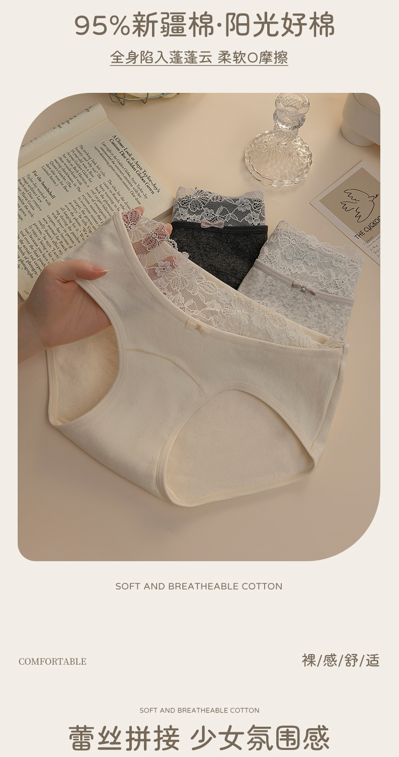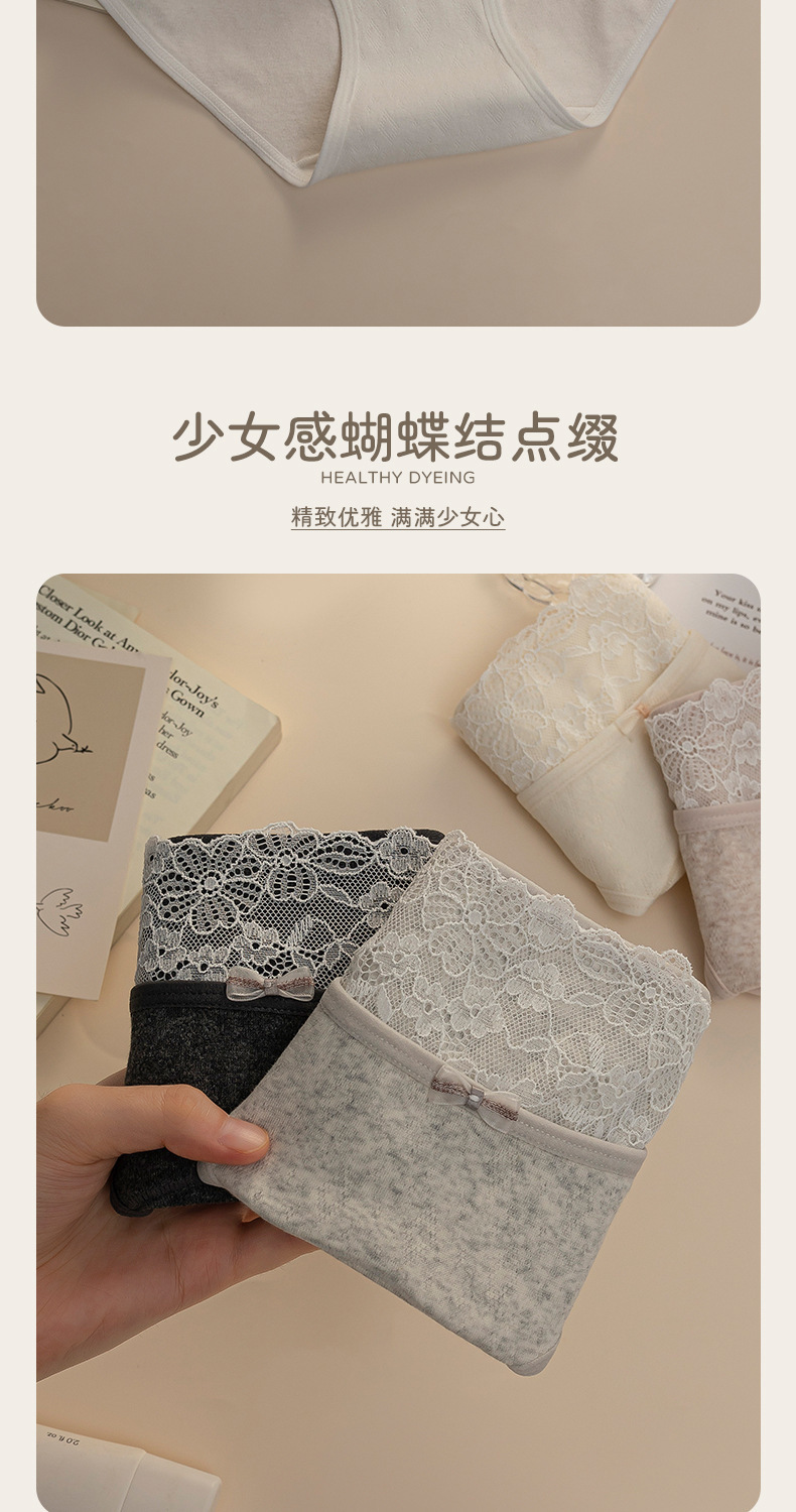 10A抗菌轻蕾丝女士中腰三角内裤纯欲风蝴蝶结透气纯棉内裤加长裆