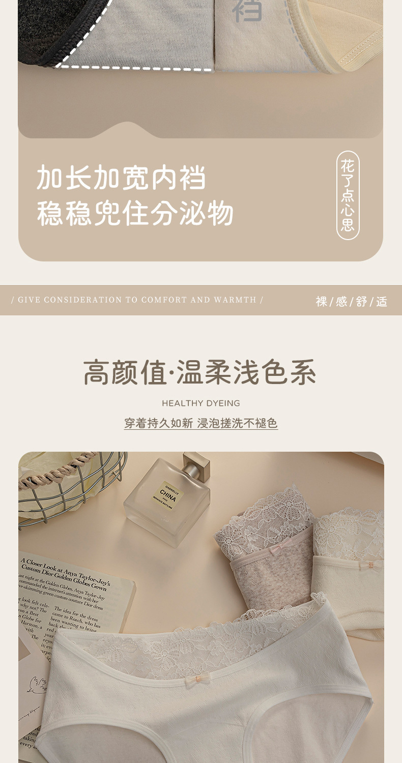 新款~10A抗菌纯棉女士内裤蕾丝中腰全棉加长裆内裤女纯欲三角短裤