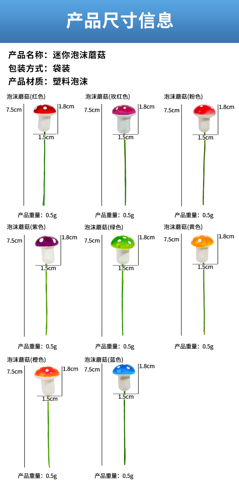 颜色 泡沫蘑菇(红色),泡沫蘑菇(玫红色),泡沫蘑菇(粉色),泡沫蘑菇(紫色),泡沫蘑菇(绿色),泡沫蘑菇(黄色),泡沫蘑菇(橙色),泡沫蘑菇(蓝色)