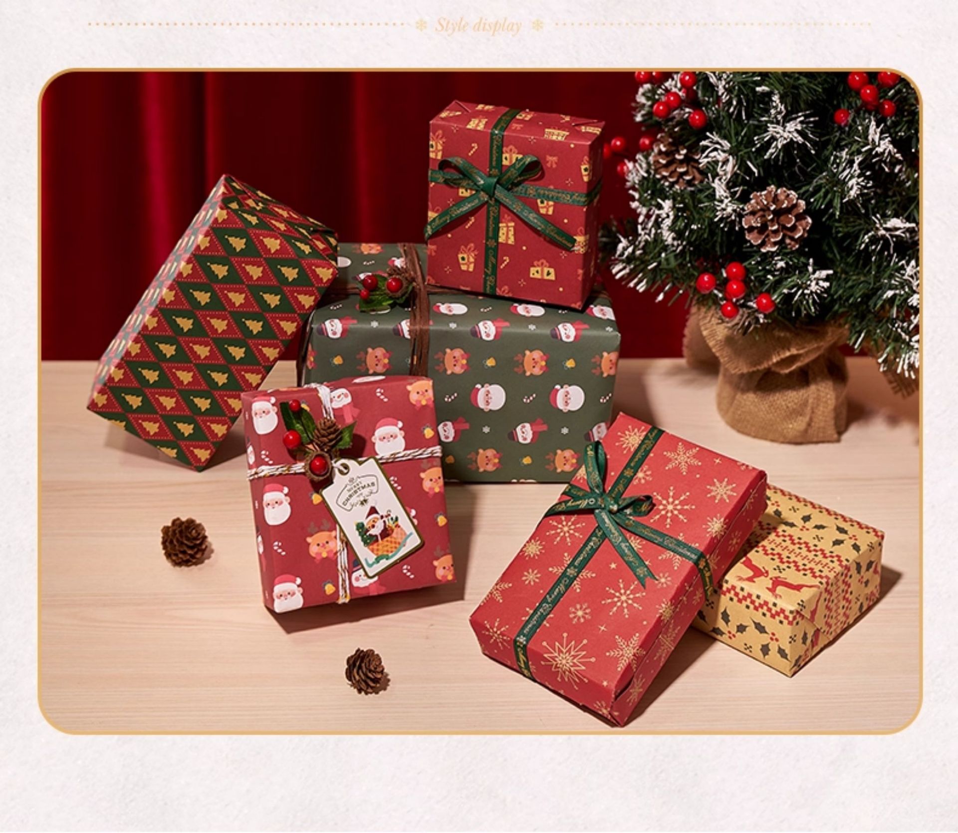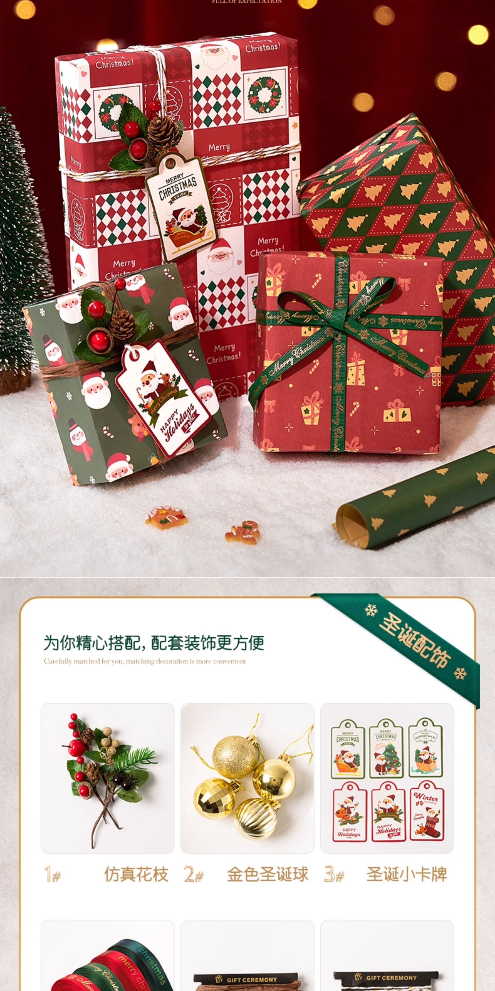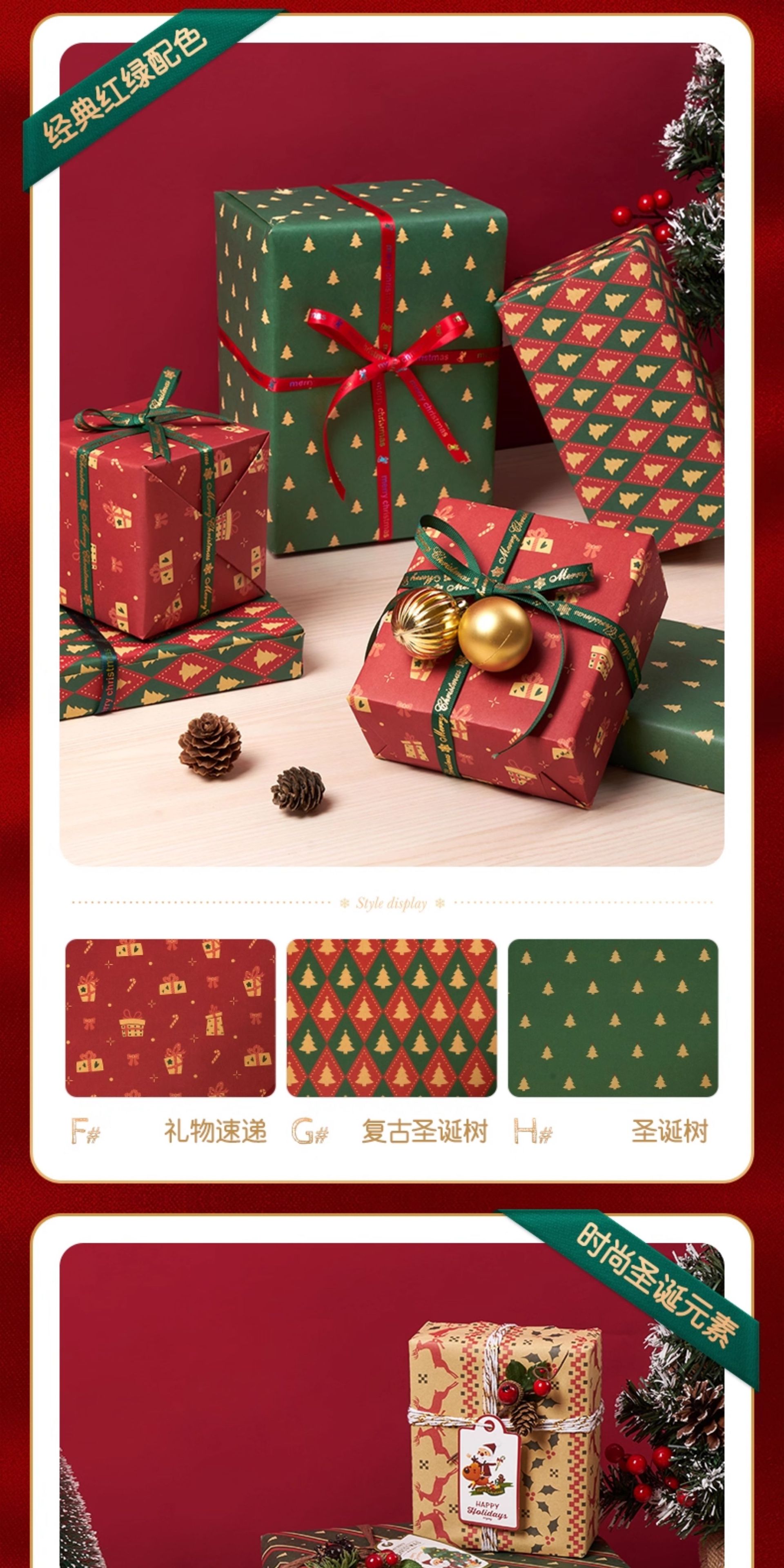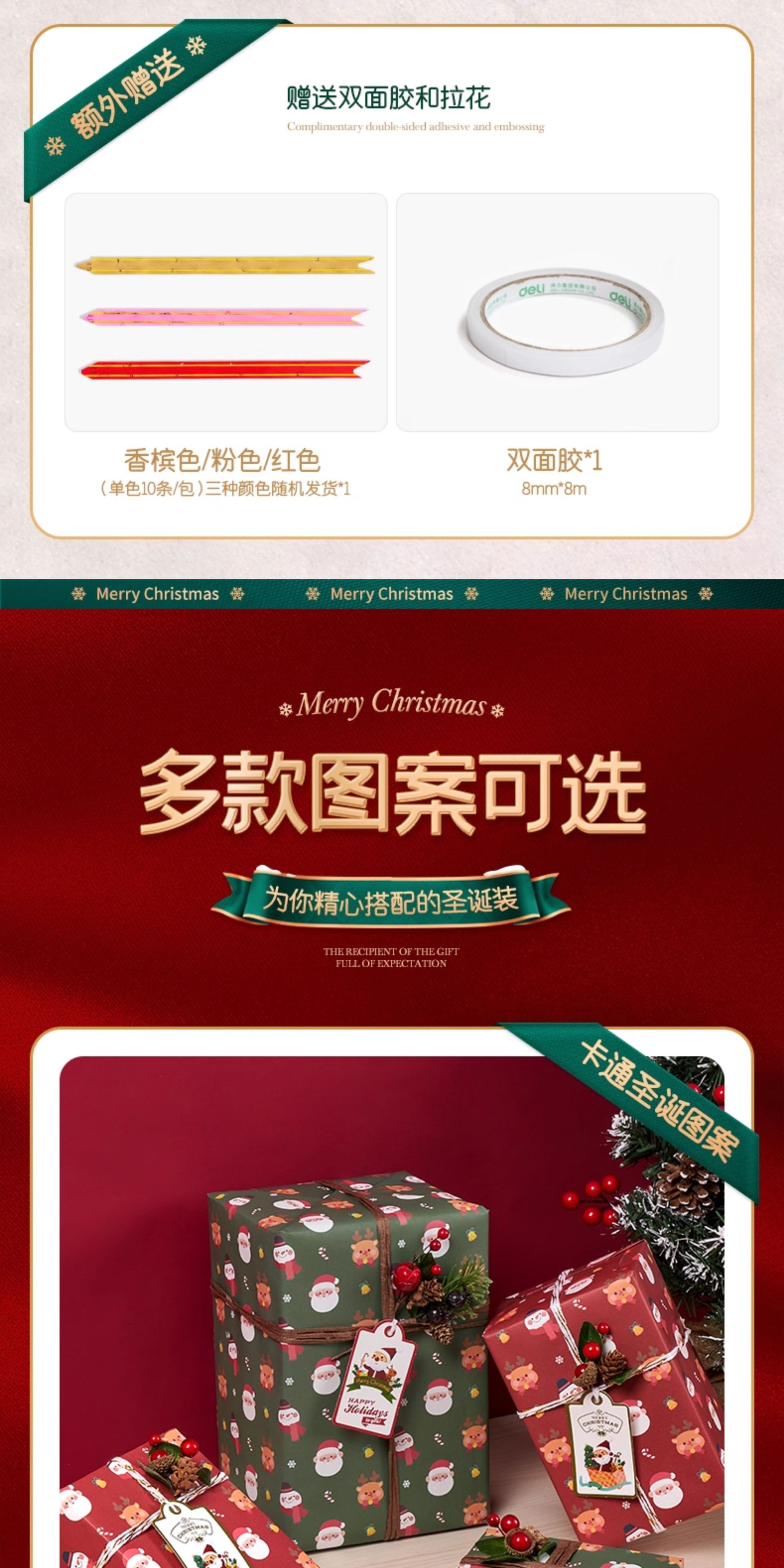规格型号 【欢乐圣诞绿-5张】送双面胶+拉花,【礼物速递红-5张】送双面胶+拉花,【圣诞树绿-5张】送双面胶+拉花,【欢度圣诞-5张】送双面胶+拉花,【欢乐圣诞红-5张】送双面胶+拉花,【绿格麋鹿绿-5张】送双面胶+拉花,红色烫金丝带【1.5cm宽 x 9m长】,绿色烫金丝带【1.5cm宽 x 9m长】