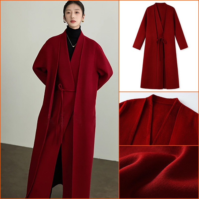 新中式高端保暖设计外套冬季新款双色双面穿羊毛系带大衣女 NX027