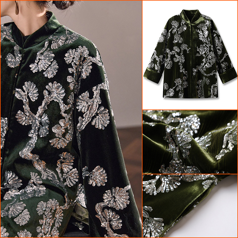 秋冬新作 新中式ベルベットボタン付きトップス 国風刺繍スパンコールグリーンコットンジャケット M3016