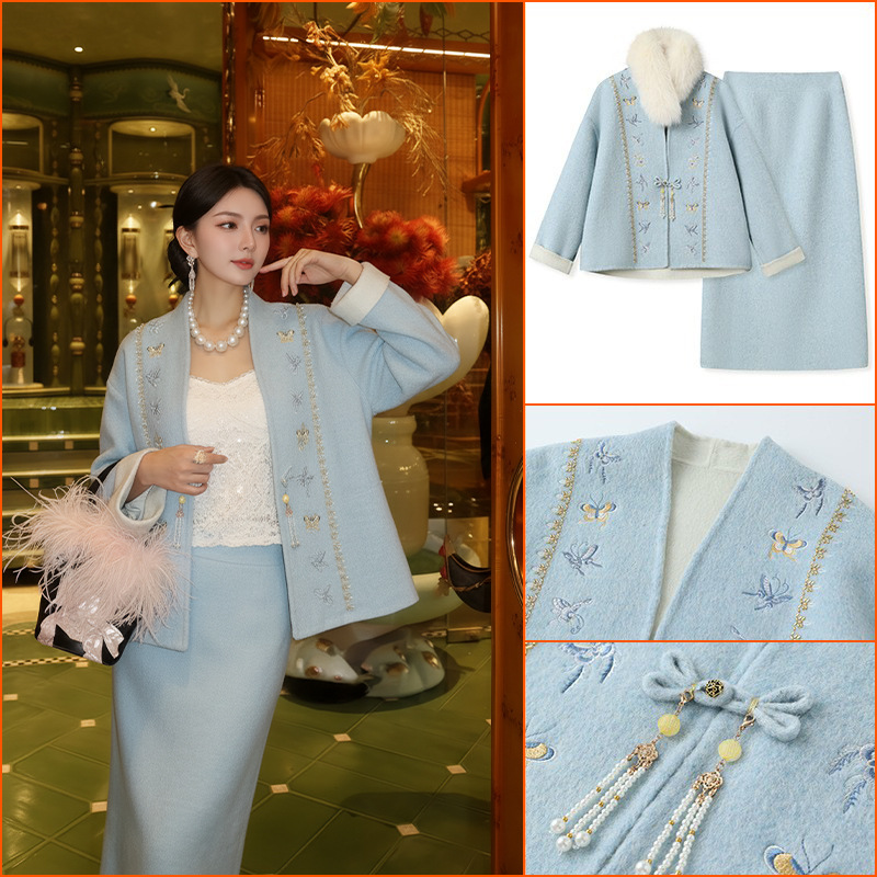 冬款新中式刺绣双面呢羊毛上衣国风复古毛呢外套+半裙套装 NY027